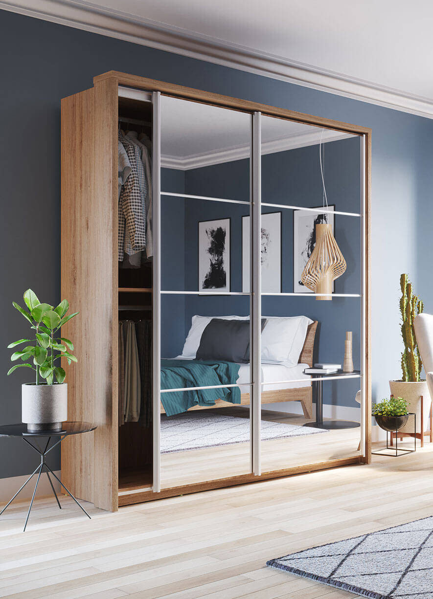 Szafa ARTI AR-17 w odcieniu dębu shetland z lustrami optycznie powiększającymi przestrzeń. Przesuwne drzwi, 3 drążki i 5 półek zapewniają funkcjonalną organizację ubrań.