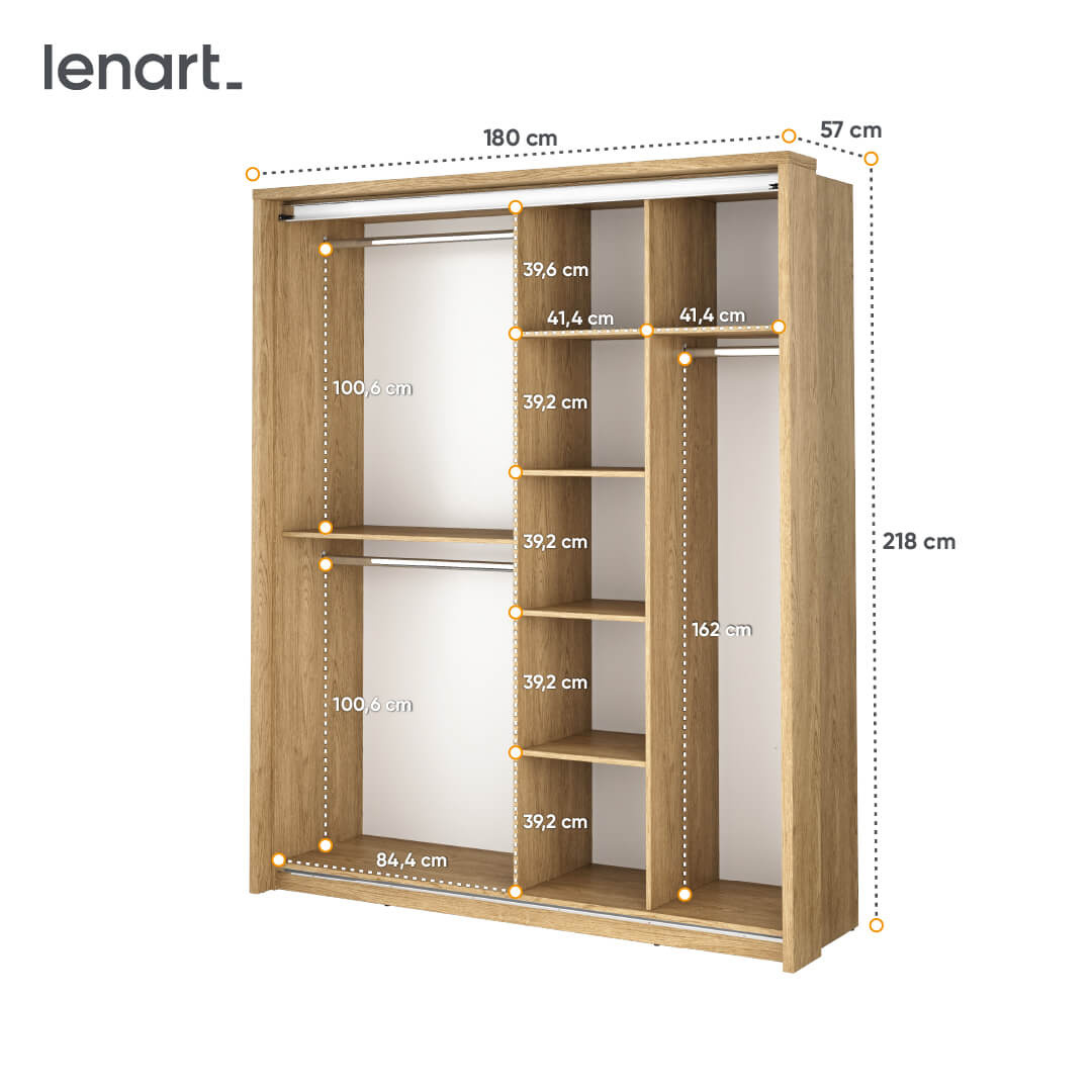 Szafa ARTI AR-17 została zaprojektowana z myślą o tych, którzy cenią sobie przestronność i porządek. Szerokość 180 cm, wysokość 218 cm oraz głębokość 57 cm pozwalają na komfortowe zagospodarowanie wnętrza, a masa wynosząca 202 kg świadczy o solidności konstrukcji. Wnętrze wyposażono w trzy solidne drążki na wieszaki oraz aż pięć pojemnych półek, co daje mnóstwo miejsca na ubrania i inne akcesoria.