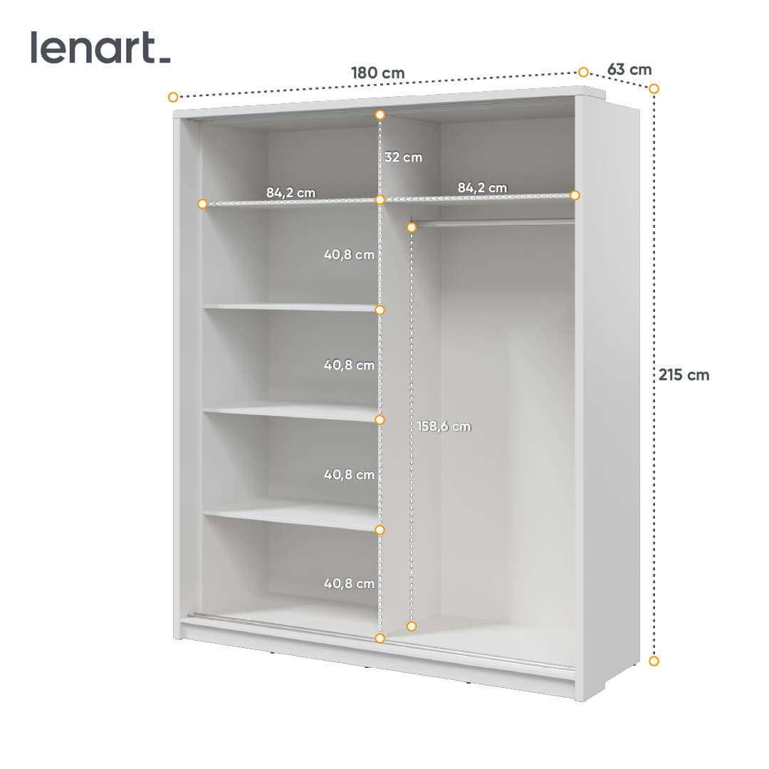 Majestatyczna szerokość 180 cm, imponująca wysokość 215 cm i optymalna głębokość 63 cm to nie tylko imponujące wymiary ale również gwarancja przestronności, która pozwoli na przechowywanie licznych ubrań i akcesoriów. Dzięki solidnej konstrukcji z płyt wiórowych laminowanych o grubości 16mm i 32mm, a także wykończeniu krawędzi korpusu i blatu o grubości 0,45mm i 1,7mm, nasza szafa AR-25 gwarantuje stabilność i trwałość na lata.