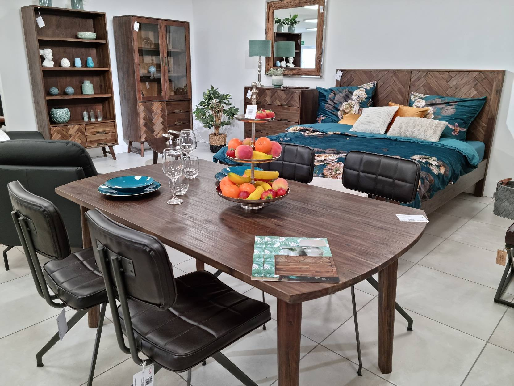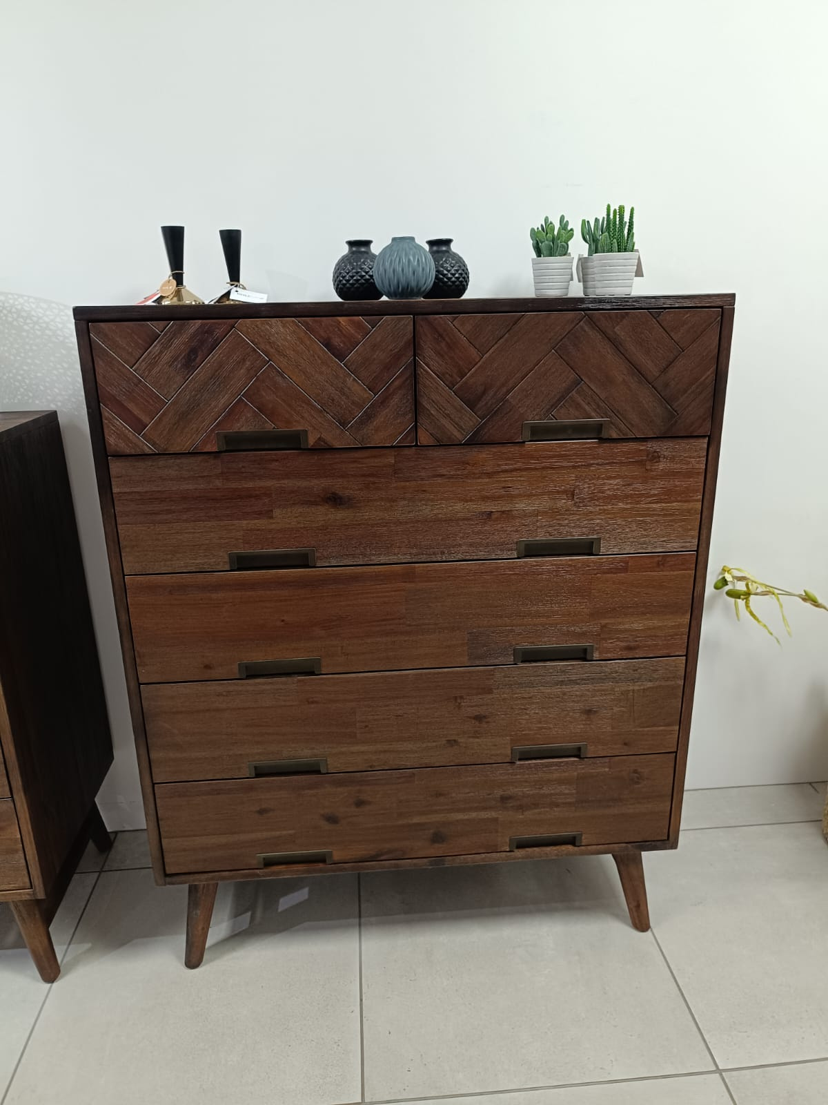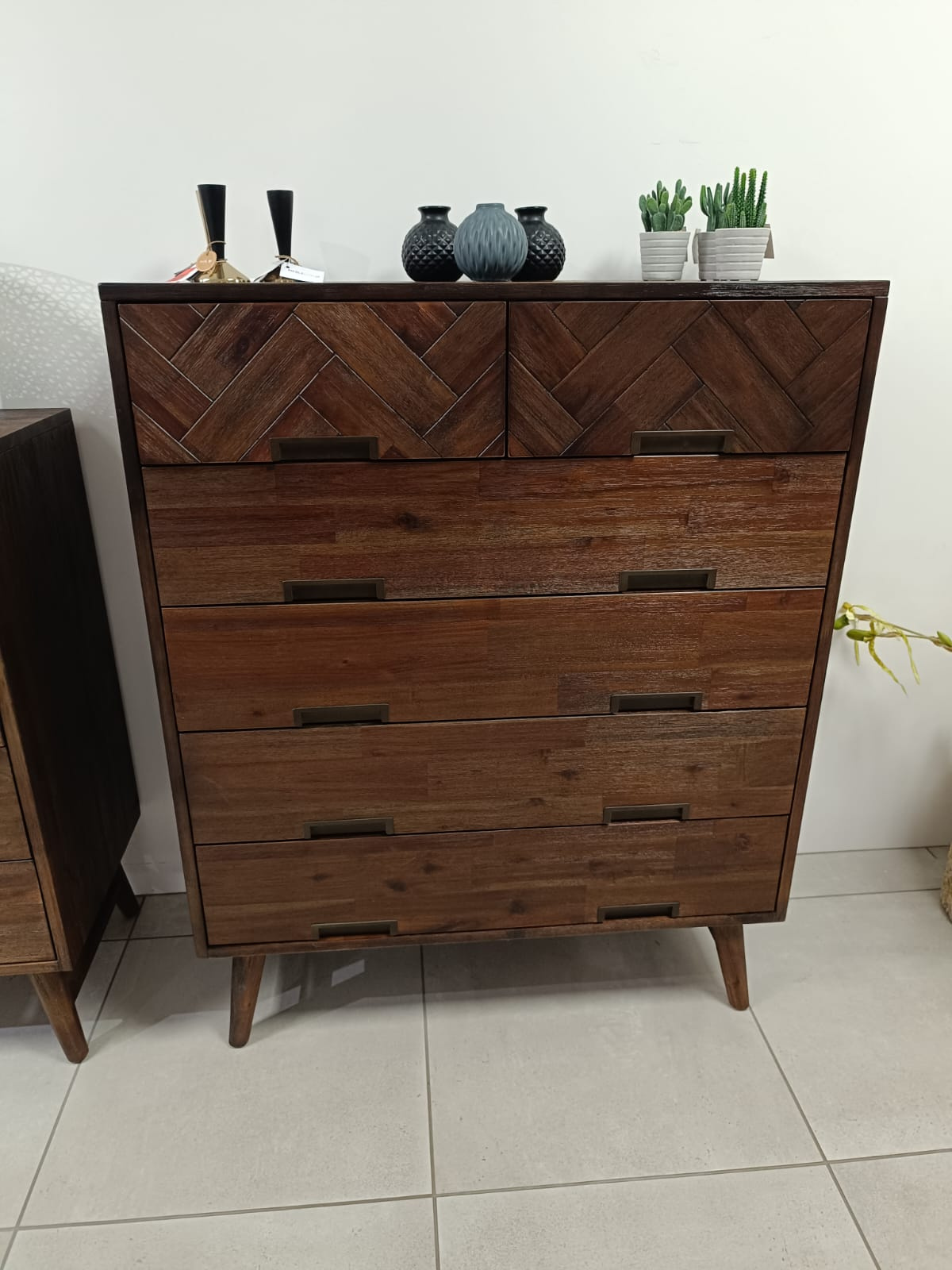Jeżeli jesteś miłośnikiem łączenia form, nietuzinkowego designu i solidnych, drewnianych mebli - meble z kolekcji Ashton stworzone zostały dla Ciebie. Piękna i okazała komoda z sześcioma szufladami i ciekawie zaprojektowanymi frontami skutecznie wypełni Twoje wnętrze stylem i elegancją. Fronty dwóch górnych szuflad ozdobione są modną dla stylu retro oraz vintage intarsją. Geometryczne metalowe okucia nie odwracają uwagi od całości bryły, ale dodają ciekawy akcent całej konstrukcji. Tak samo, jak charakterystyczne dla tej kolekcji drewniane, proste, smukłe nóżki łączone dodatkową poziomą belką, podkreślające oldschoolowy design i solidność formy. Komoda dzięki barwie głębokiego brązu doskonale prezentuje się w jasnych lub surowych wnętrzach. Fantazyjnie łączy się ze wzorzystymi tapetami i naturalną zielenią kwiatów doniczkowych. Wzbogać swoje wnętrza meblami świadczącymi o Twoim wyrafinowanym guście i twórz piękne, przytulne przestrzenie.