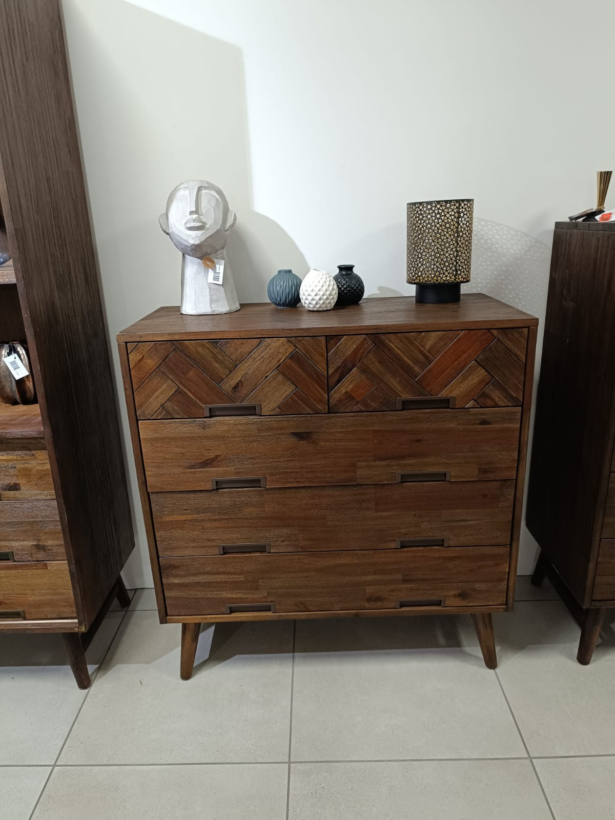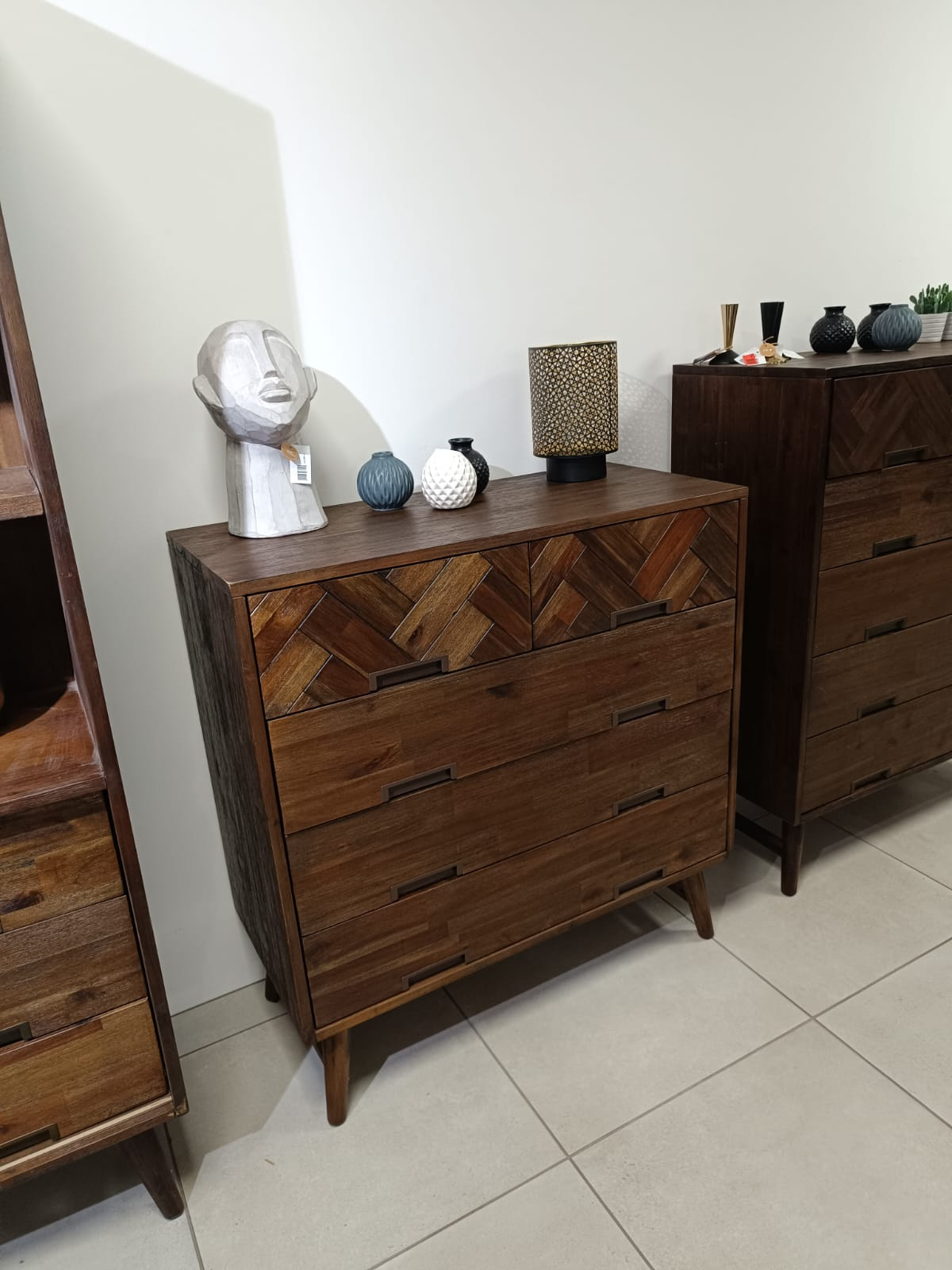 Komoda Ashton to najwyższa jakość. Drewniana komoda jest gwarancją trwałości, a dzięki temu, że zadbano również o wyjątkowy design, będzie atrakcyjnym dodatkiem wyposażenia. Ten model komody posiada trzy szerokie i pojemne szuflady oraz dwie mniejsze w górnej części. Efektowna i modna intarsja na frontach górnych szuflad, metalowe okucia w kolorze starego złota oraz nóżki w stylu retro spójnie tworzą oryginalny projekt, który sprawdzi się zarówno w sypialni jak i w salonie czy korytarzu.