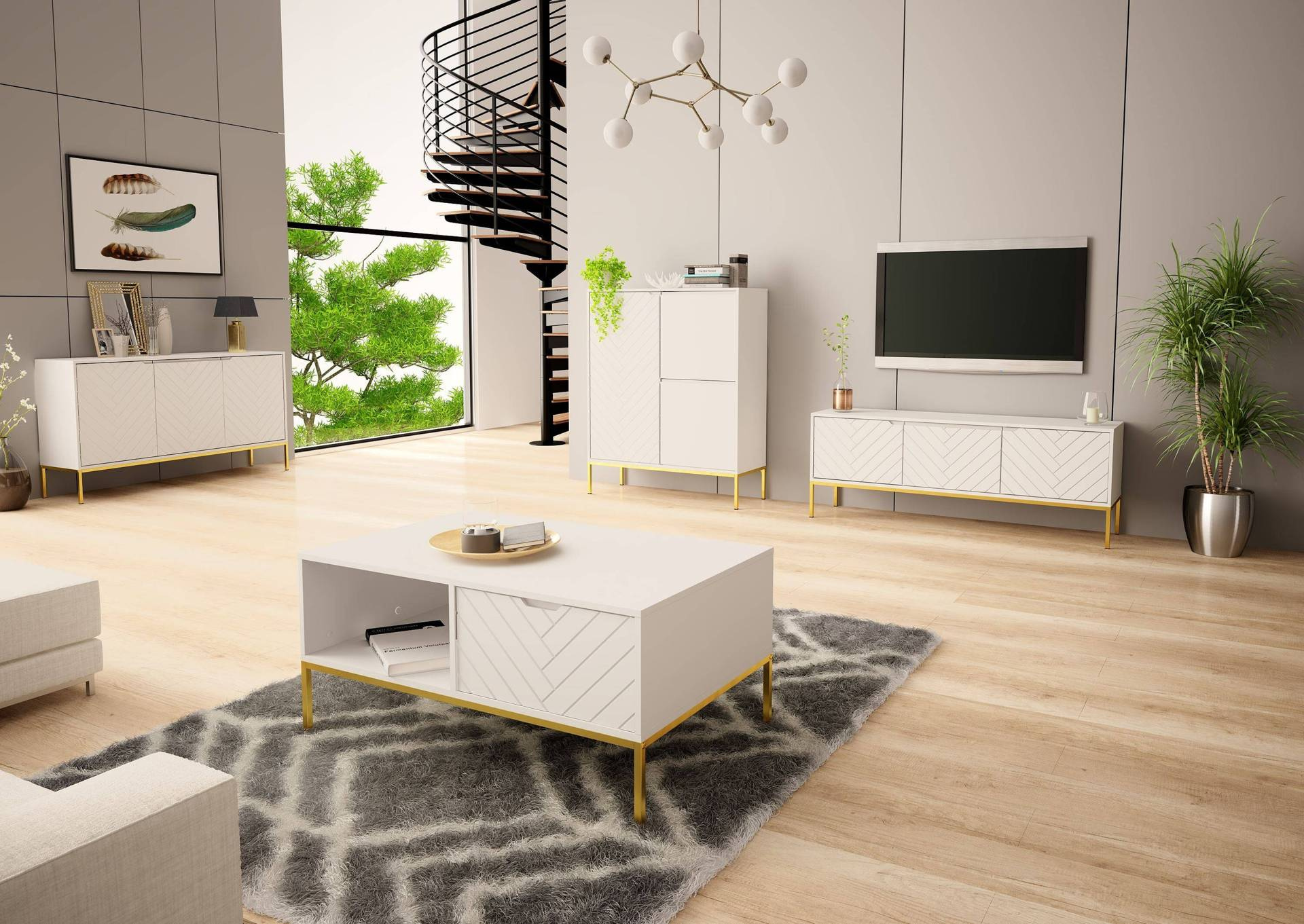 - Stylowa komoda RTV ASPEN-01 firmy Megstyl łączy biały mat z złotym metalowym stelażem, tworząc nowoczesny, elegancki design. Trzy drzwi z cichym domykiem zapewniają wygodę użytkowania. Idealna do nowoczesnych wnętrz.
