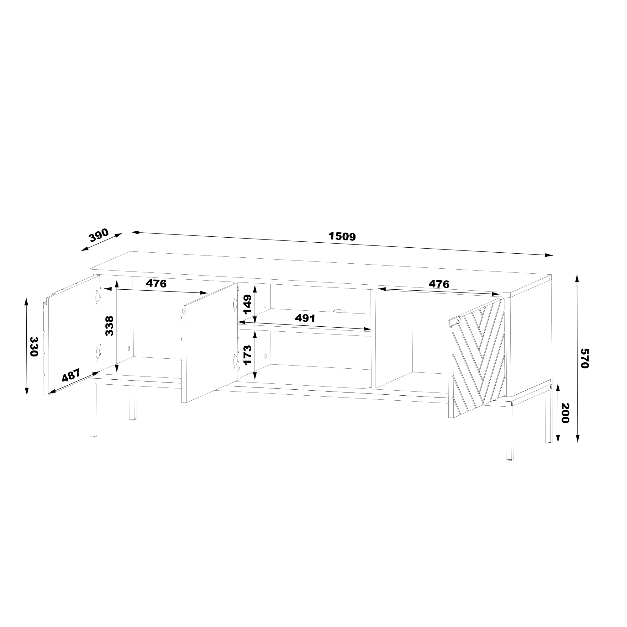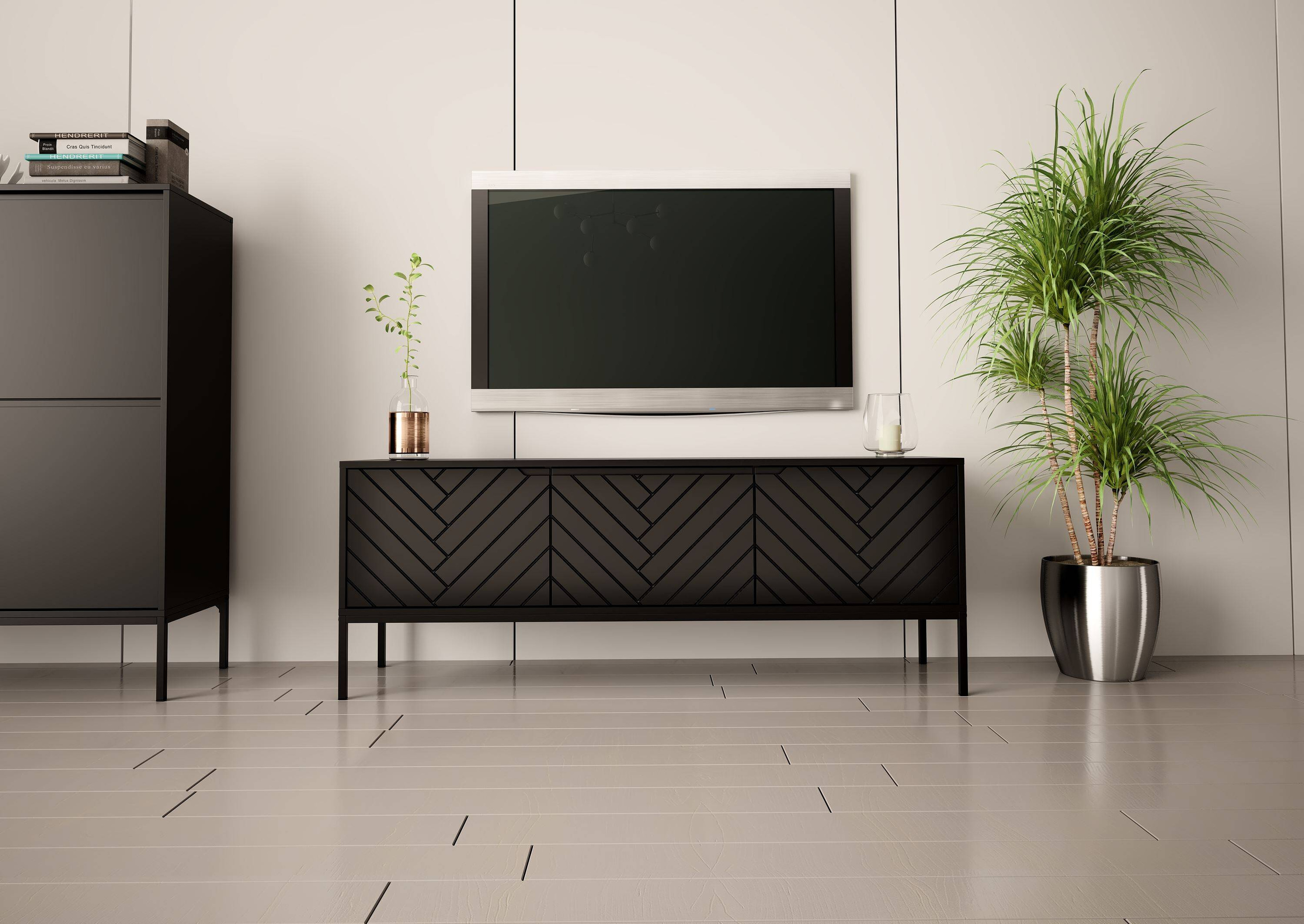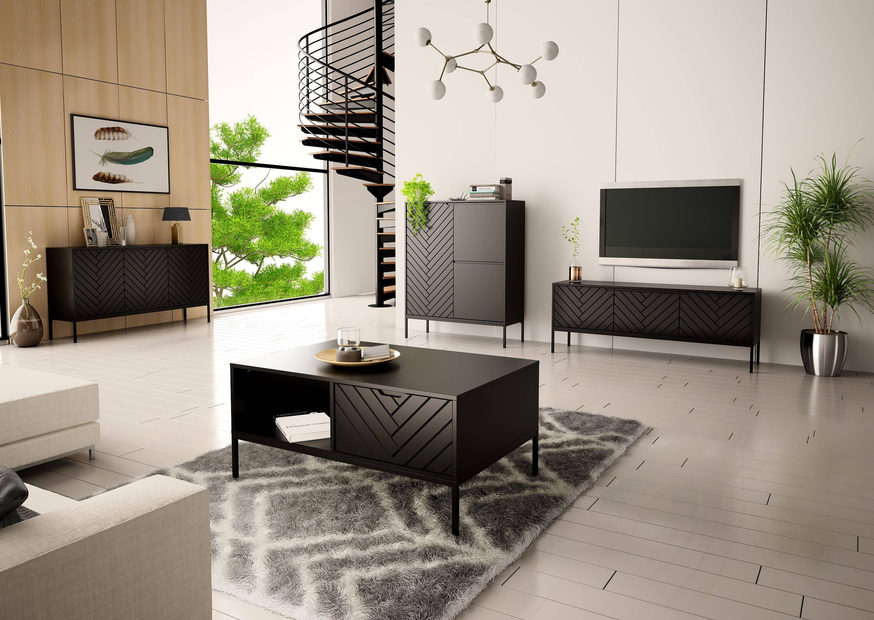 ASPEN-01 to produkt, który wyróżnia się nie tylko wyglądem, ale również praktycznym zastosowaniem. Trzy drzwi szafki RTV zapewniają dużo miejsca na przechowywanie sprzętu audio-wideo oraz innych niezbędnych rzeczy, dzięki czemu możesz cieszyć się porządkiem i harmonie w Twoim salonie. Czarne matowe wykończenie korpusu oraz frontów tworzy spójną i elegancką całość, która zachwyci nawet najbardziej wymagających klientów.