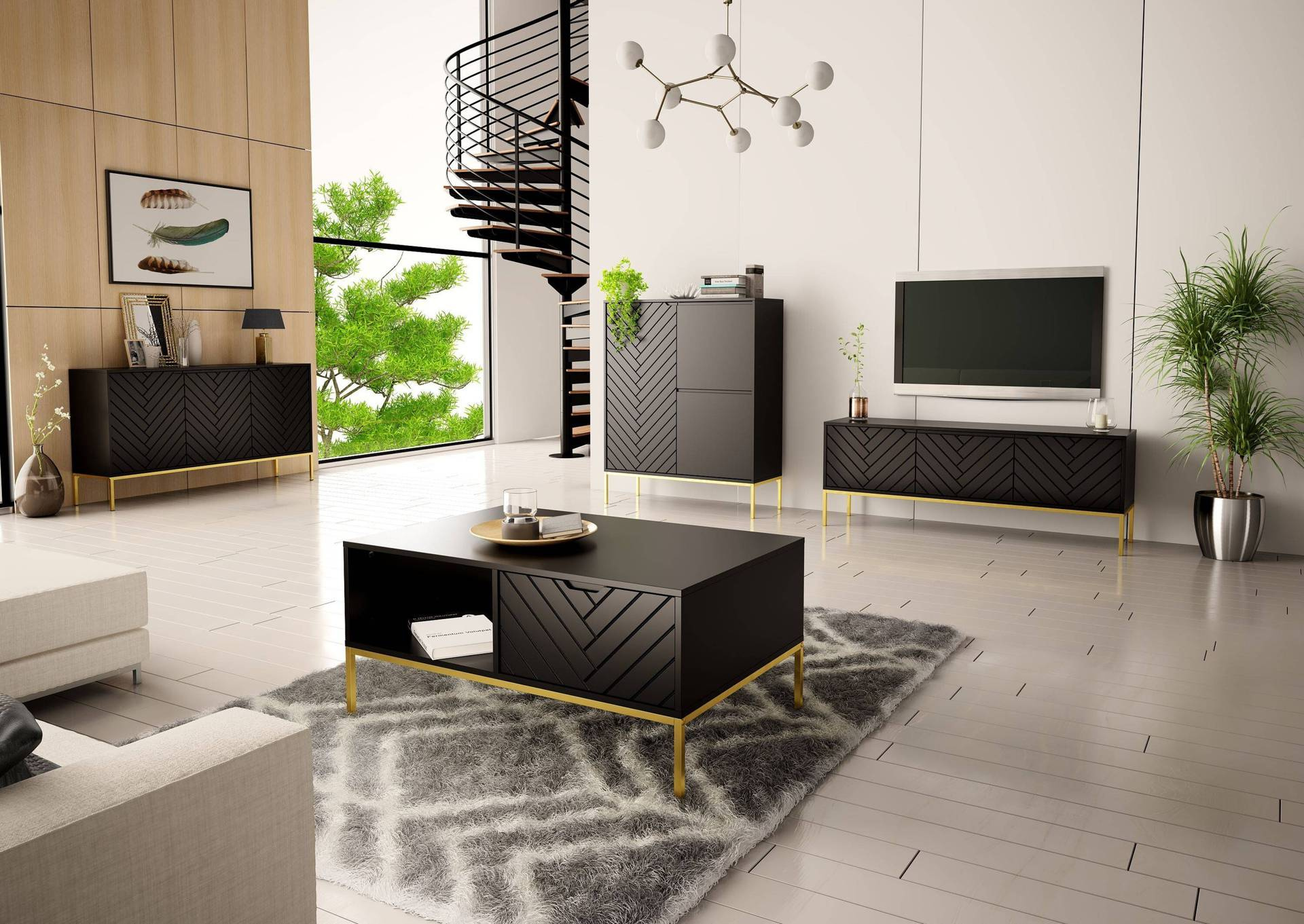 Komoda RTV ASPEN-01 łączy nowoczesny styl i funkcjonalność. Wykonana z czarnego matowego MDF i laminowanej płyty, z eleganckim złotym metalowym stelażem. Wyposażona w cichy domyk. Idealna do każdego modnego wnętrza.