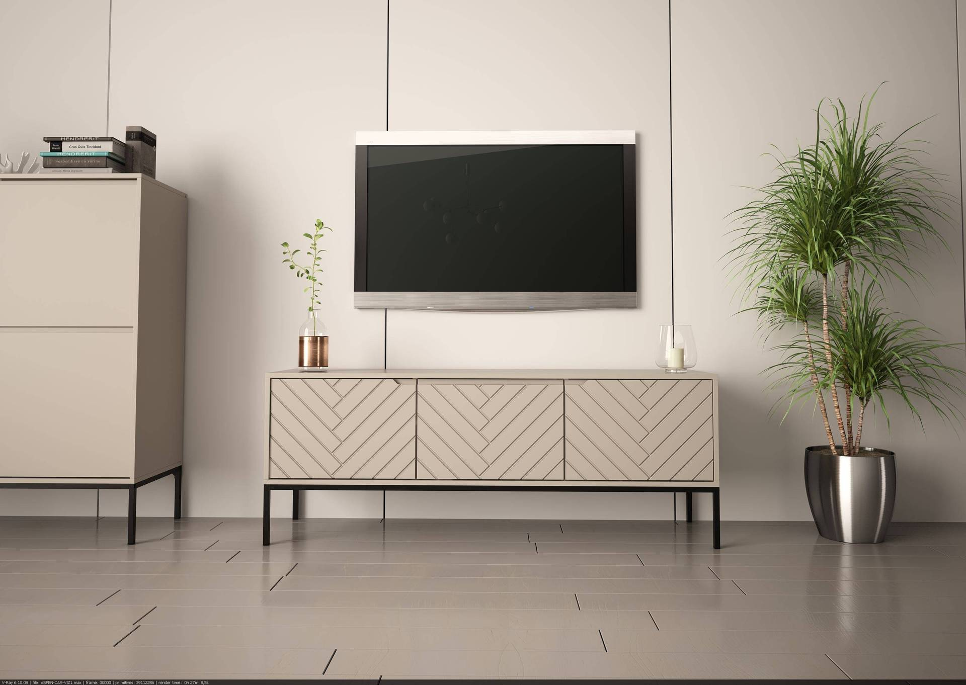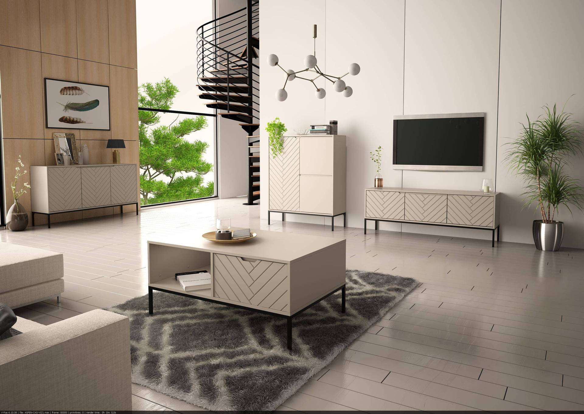 - Elegancka komoda RTV ASPEN-01 w kolorze kaszmir, doskonała do nowoczesnych wnętrz. Wyposażona w 3 drzwi, z systemem cichego domyku, front z płyty MDF na czarnym metalowym stelażu. Idealna do samodzielnego montażu.