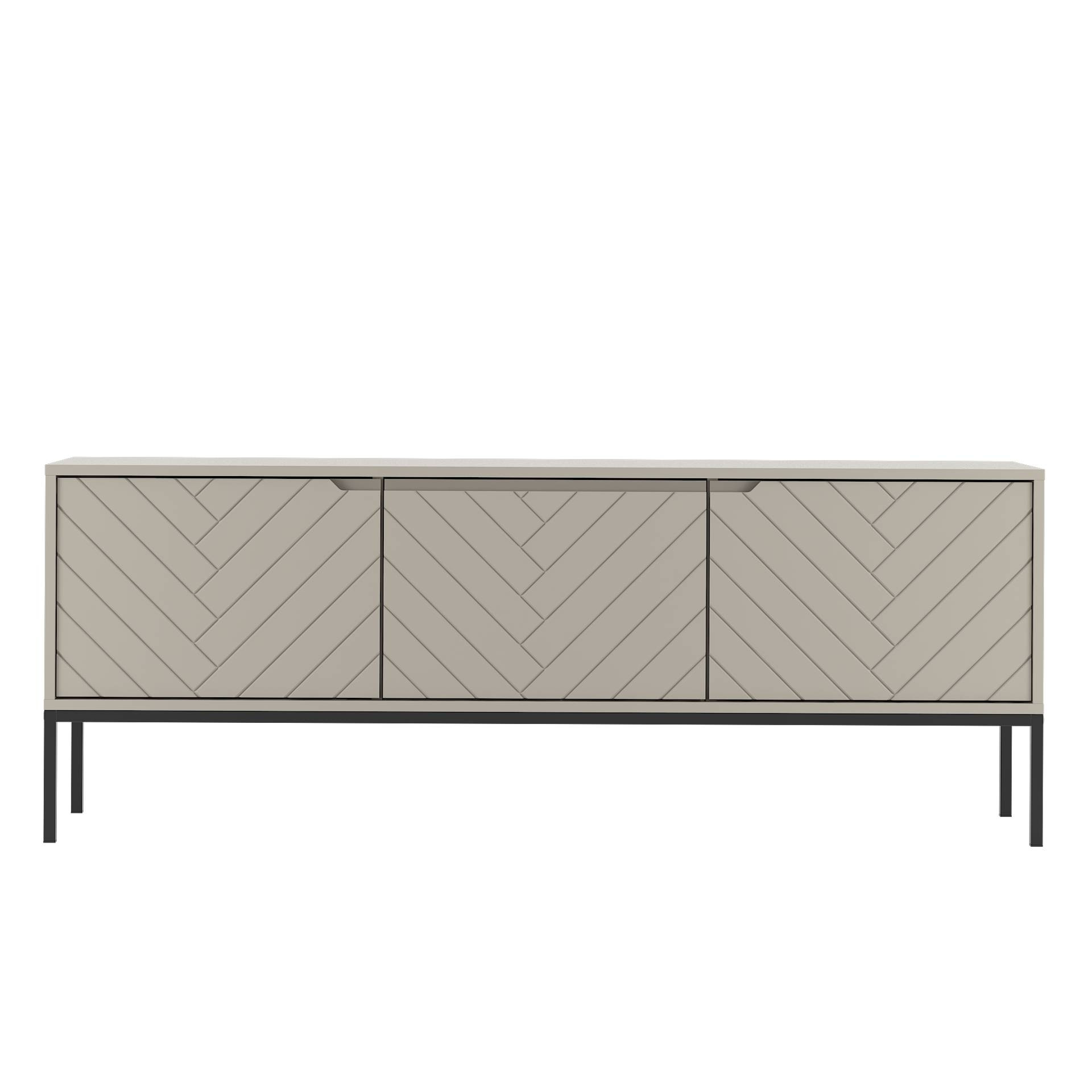 Elegancka komoda RTV ASPEN-01 w kolorze kaszmir, doskonała do nowoczesnych wnętrz. Wyposażona w 3 drzwi, z systemem cichego domyku, front z płyty MDF na czarnym metalowym stelażu. Idealna do samodzielnego montażu.