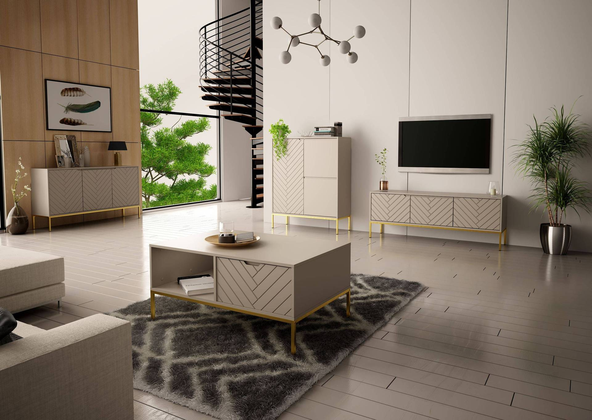 Komoda RTV ASPEN-01 to kwintesencja nowoczesnej elegancji i funkcjonalności w jednym. Jej niepowtarzalny design sprawia, że staje się ona centralnym punktem każdego salonu, dodając mu szczyptę luksusu. Zestawienie kaszmirowych frontów oraz korpusu z metalowym, złotym stelażem tworzy harmonijną całość, która zachwyca od pierwszego wejrzenia i emanuje subtelnym stylem.