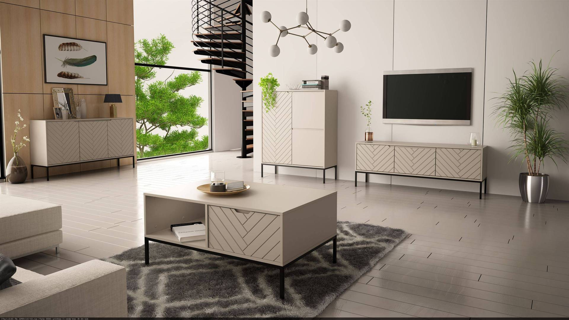 • Komoda ASPEN-03 marki Megstyl to stylowy dodatek do wnętrz. Wykonana z płyty MDF w kolorze kaszmir, z czarnym metalowym stelażem, oferuje elegancję i funkcjonalność. Cichy domyk dodaje komfortu, a samodzielny montaż pozwala na łatwą personalizację.