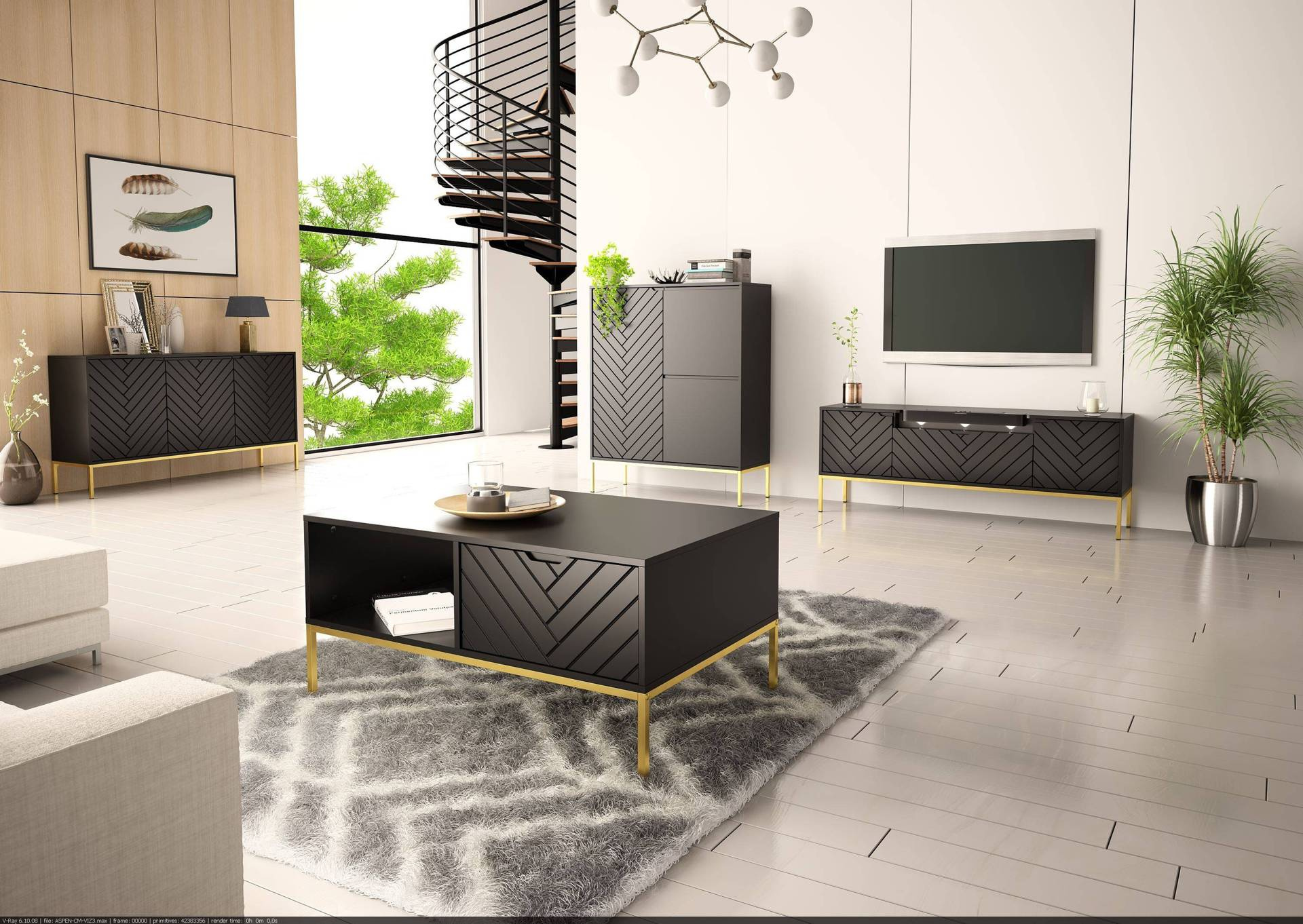 - Komoda RTV ASPEN-06 łączy elegancję z funkcjonalnością. Wykonana z czarnego matowego MDF i złotego metalowego stelaża. Oświetlenie LED o neutralnym białym odcieniu tworzy wyjątkowy klimat. W zestawie Soundbar JBL Bar 2.0.