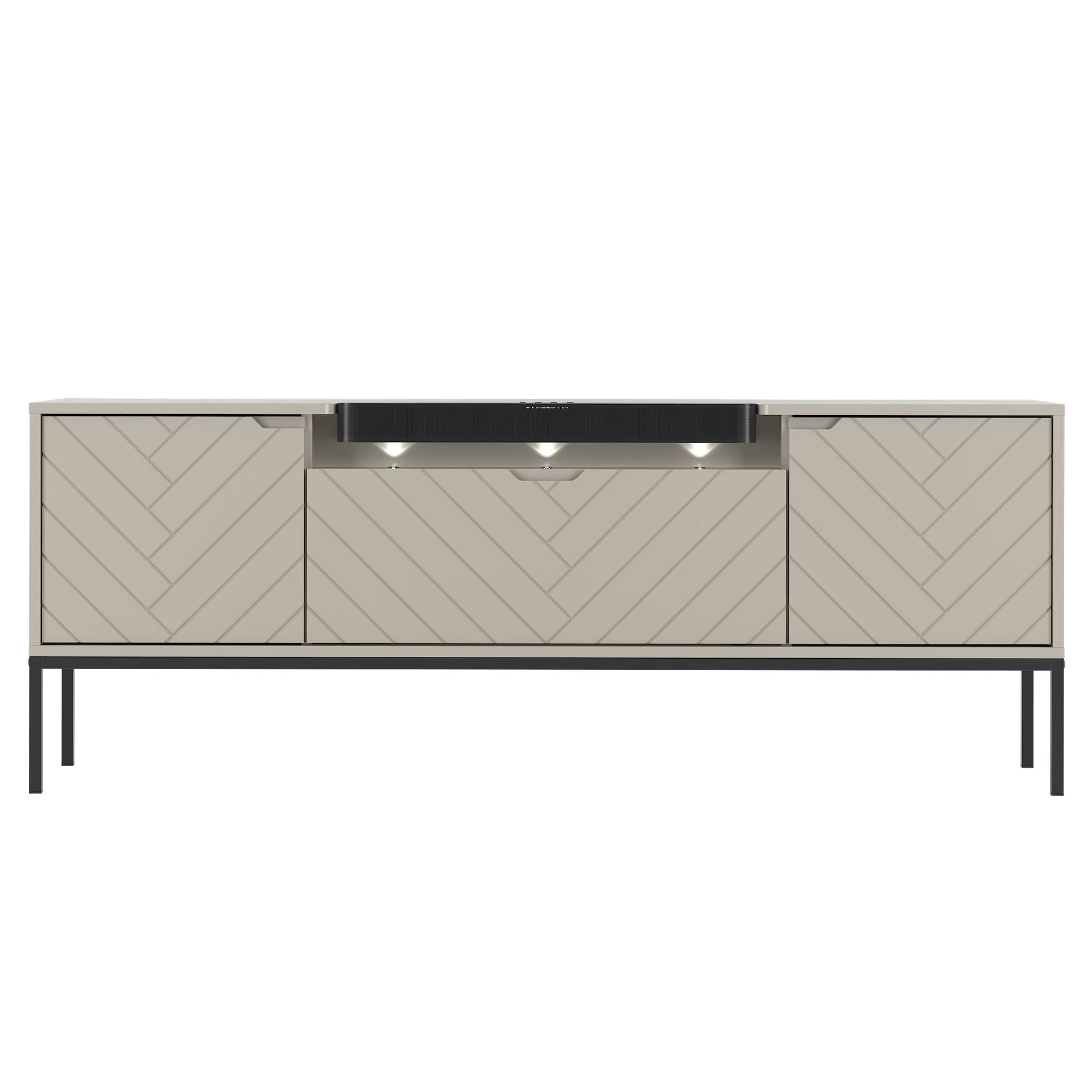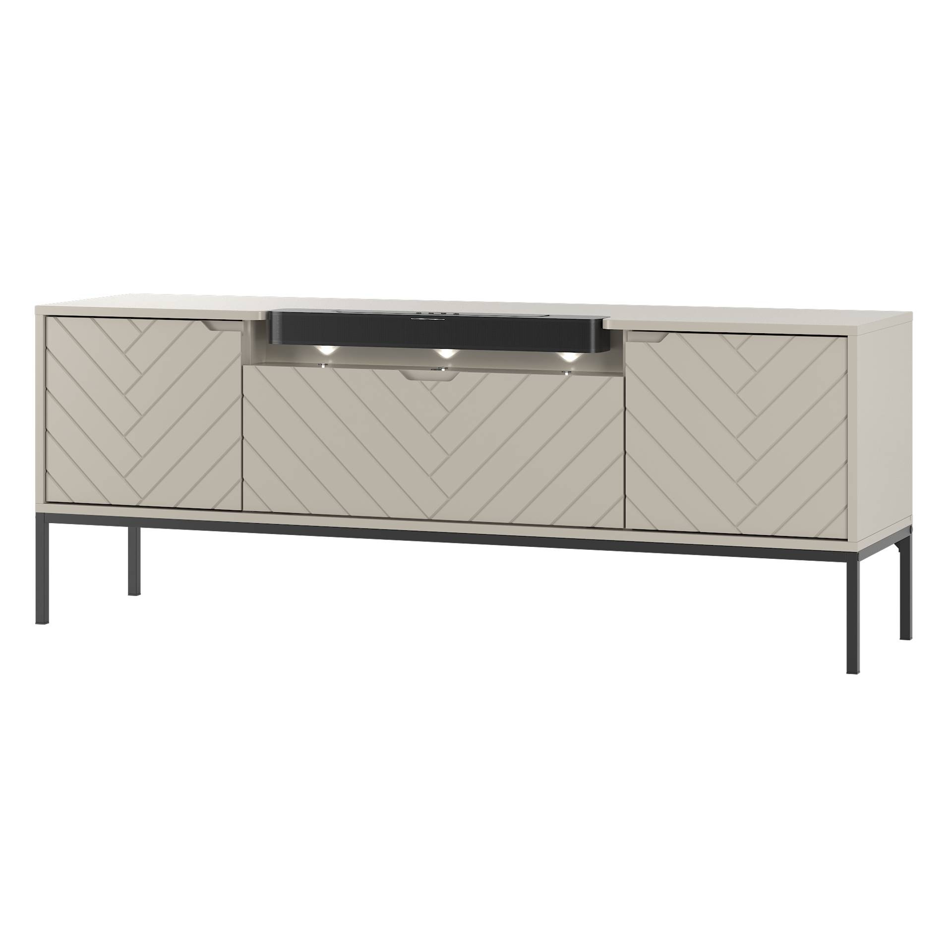 Stylowa komoda RTV ASPEN-06 łączy elegancję i nowoczesne funkcje. W zestawie soundbar JBL, intuicyjny system push to open i oświetlenie LED. Kaszmirowe wykończenie i czarny metalowy stelaż dodają uroku, zapewniając doskonałe wrażenia audiowizualne.