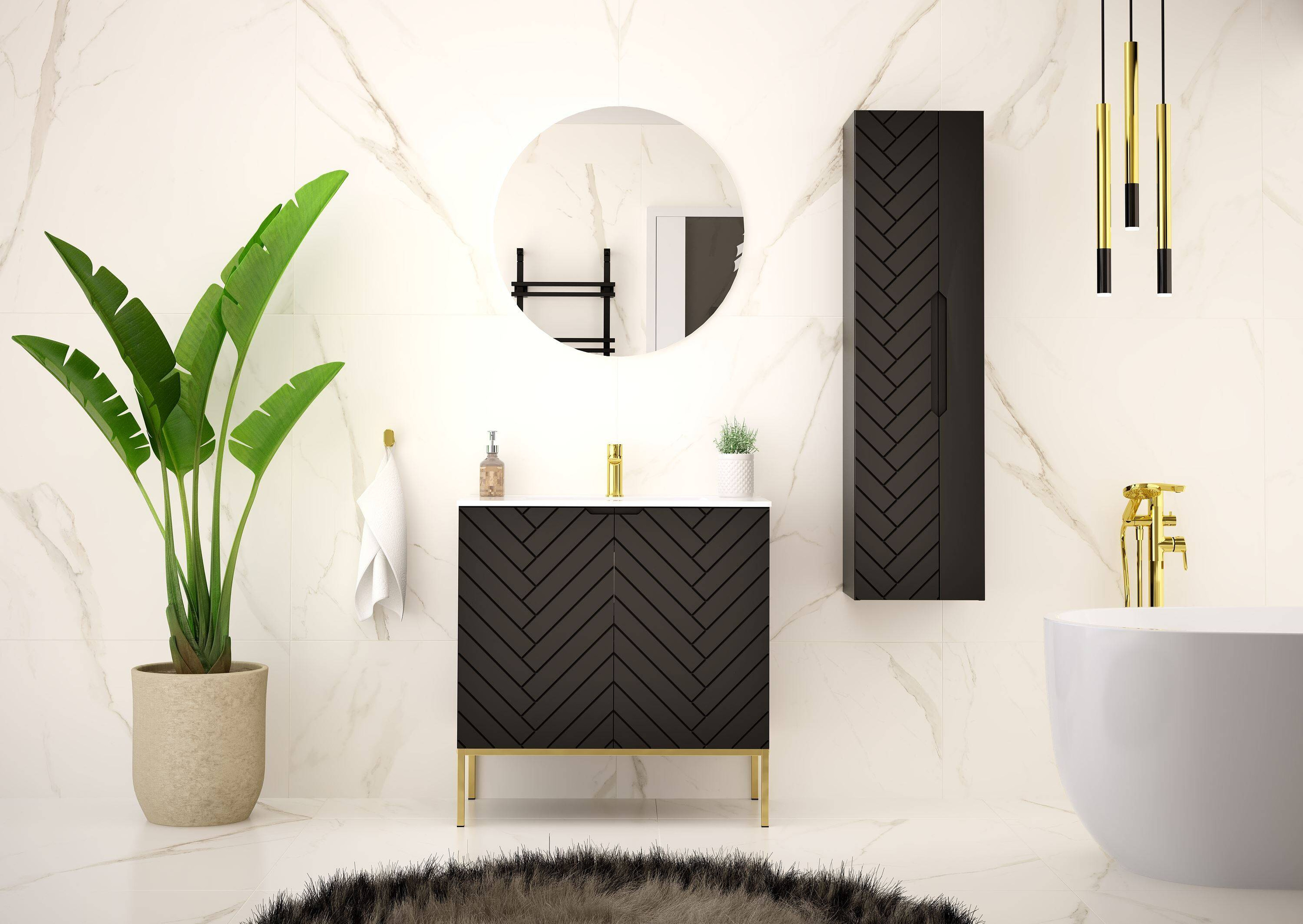 Nowoczesna szafka pod umywalkę ASPEN-08 marki Megstyl to prawdziwa perła designu, która wprowadzi elegancję i luksus do Twojej łazienki. Jej czarny matowy kolor w połączeniu ze złotym stelażem tworzy wyjątkowy duet, który przyciągnie wzrok każdego miłośnika stylowych wnętrz. Dzięki swojej smukłej formie oraz doskonale dobranym proporcjom, szafka ta subtelnie wpisuje się w aranżację, dodając jej nowoczesnego charakteru.