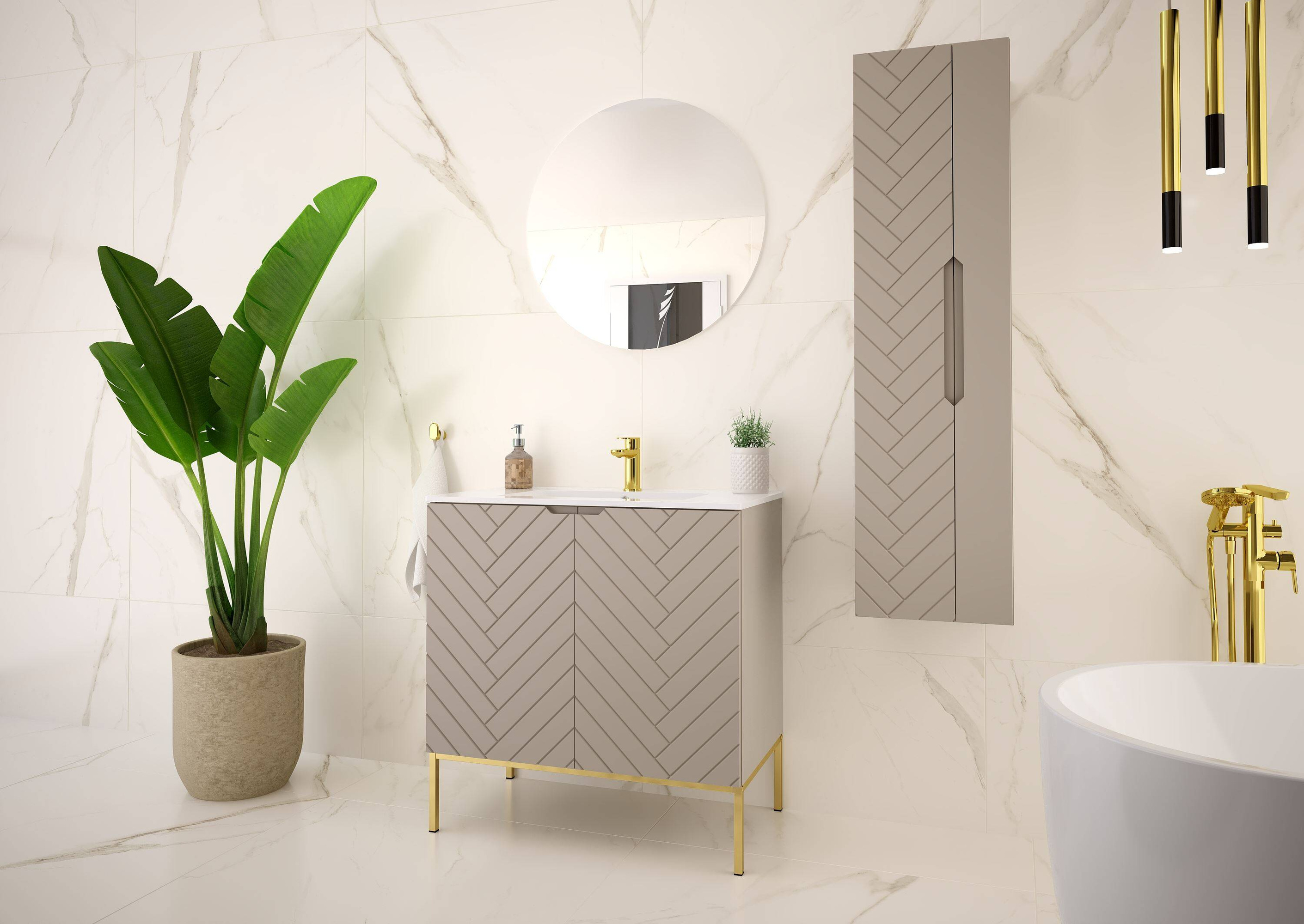 Elegancka szafka pod umywalkę ASPEN-08 w odcieniu kaszmiru z luksusowym złotym stelażem marki Megstyl. Wykonana z płyty MDF i laminowanej, wyposażona w puszkowe zawiasy z cichym domykiem. Idealna do stylowych łazienek. Samodzielny montaż.