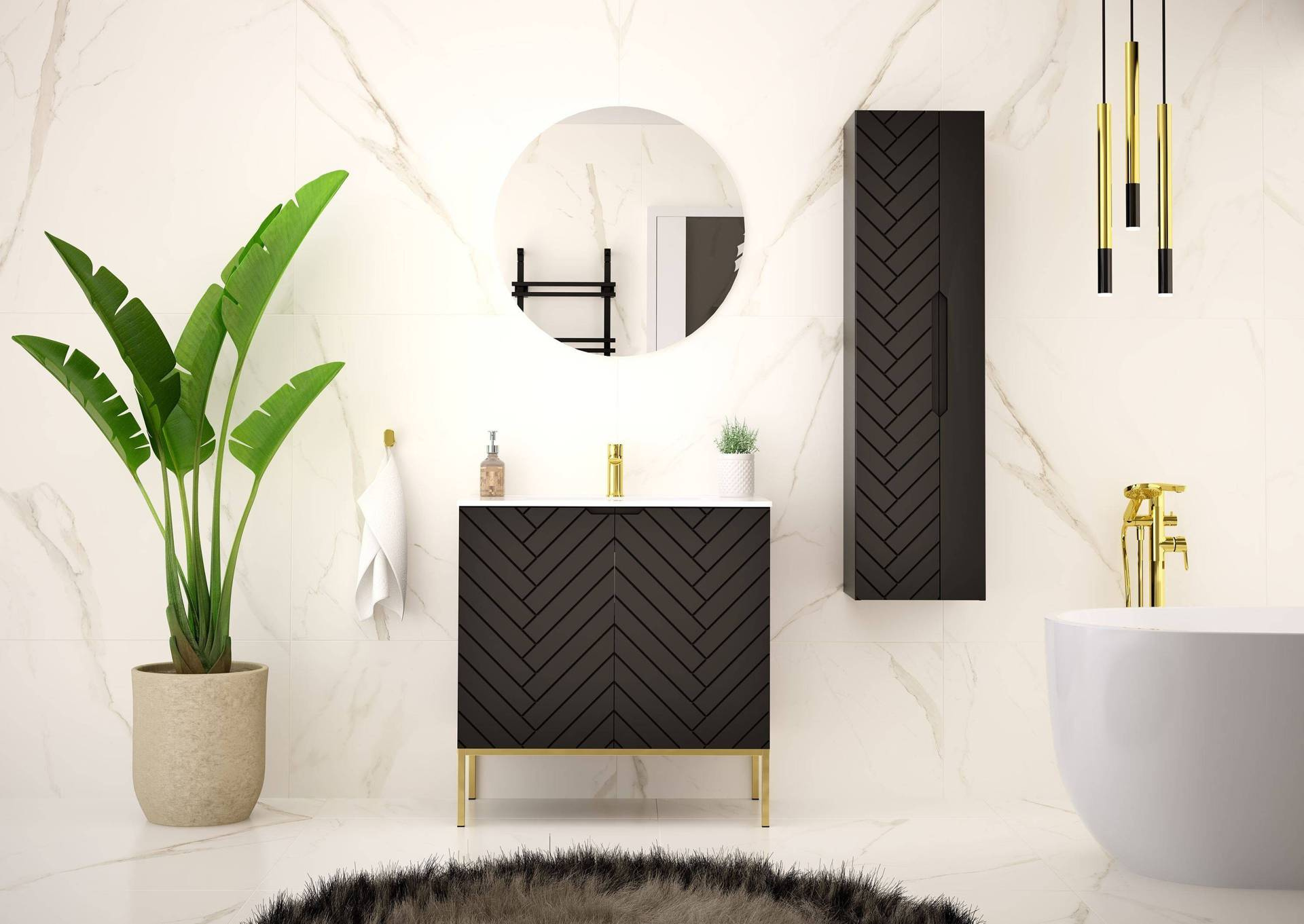 Przenieś swoją łazienkę na wyższy poziom elegancji z zestawem ASPEN-08 – elegancką szafką z umywalką, która zachwyca nowoczesnym designem i ponadczasowym stylem. Czarne matowe fronty i korpus wykonane z wysokiej jakości płyty MDF i laminowanej, tworzą harmonijną całość, która wprowadzi do Twojego wnętrza powiew luksusu. Złoty stelaż ze stali uwydatnia ekskluzywny charakter całej kompozycji, nadając wnętrzu wyjątkowego klimatu. To doskonały wybór dla osób, które pragną nadać swojej łazience niepowtarzalnego charakteru.