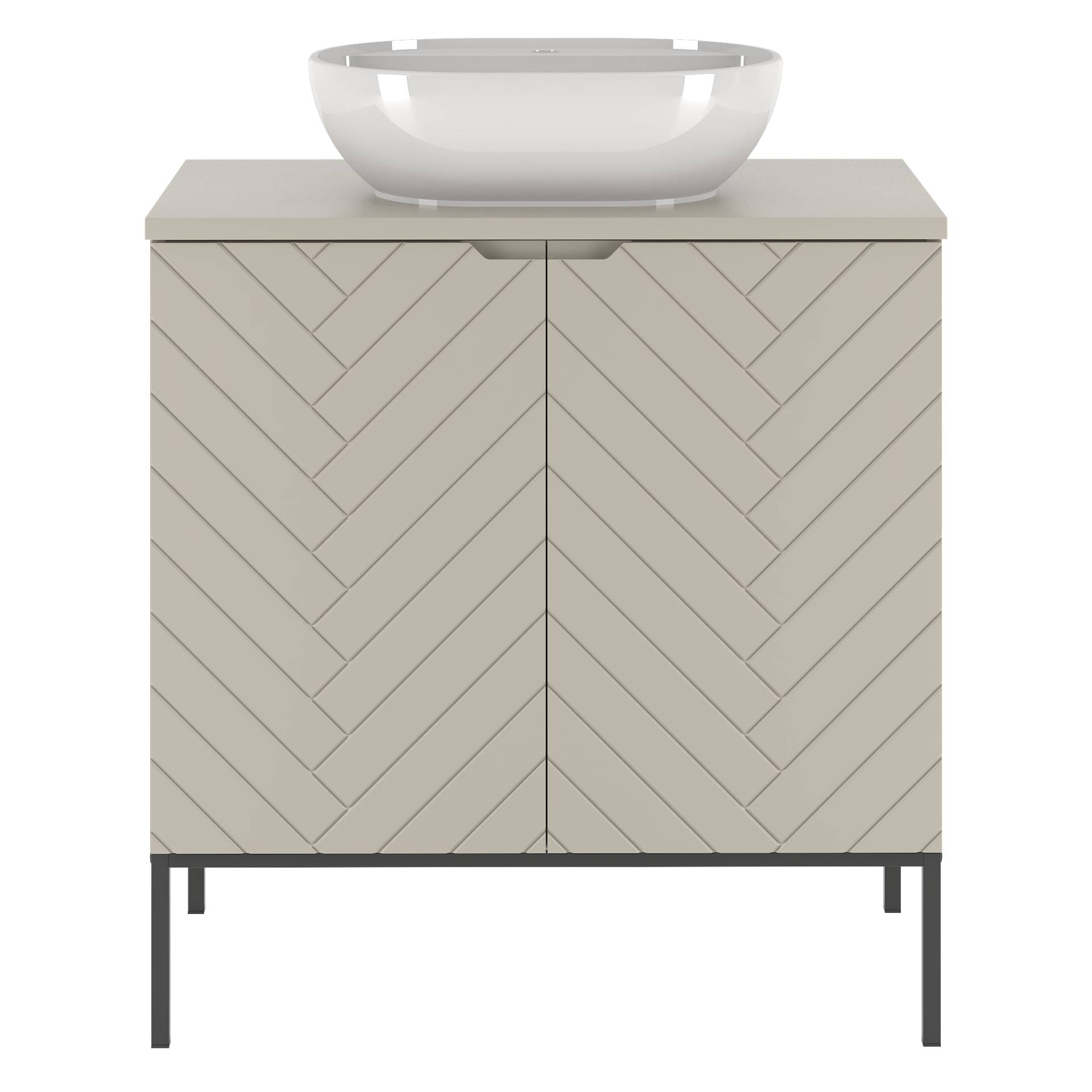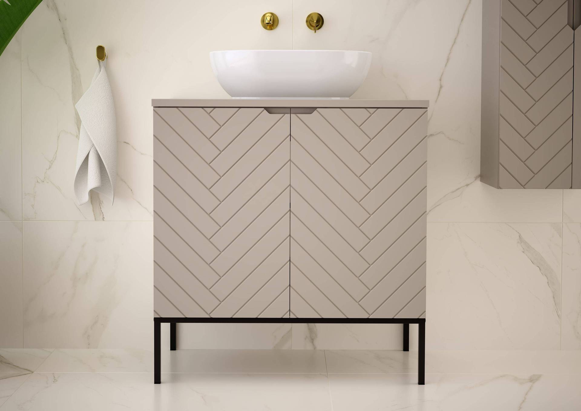 Stylowa szafka ASPEN-08 o szerokości 80 cm z umywalką nablatową. Kaszmirowy front z MDF oraz laminowany korpus tworzą elegancką całość. Czarny metalowy stelaż dodaje nowoczesnego charakteru. Ceramika sanitarna w białym połysku zachwyca.