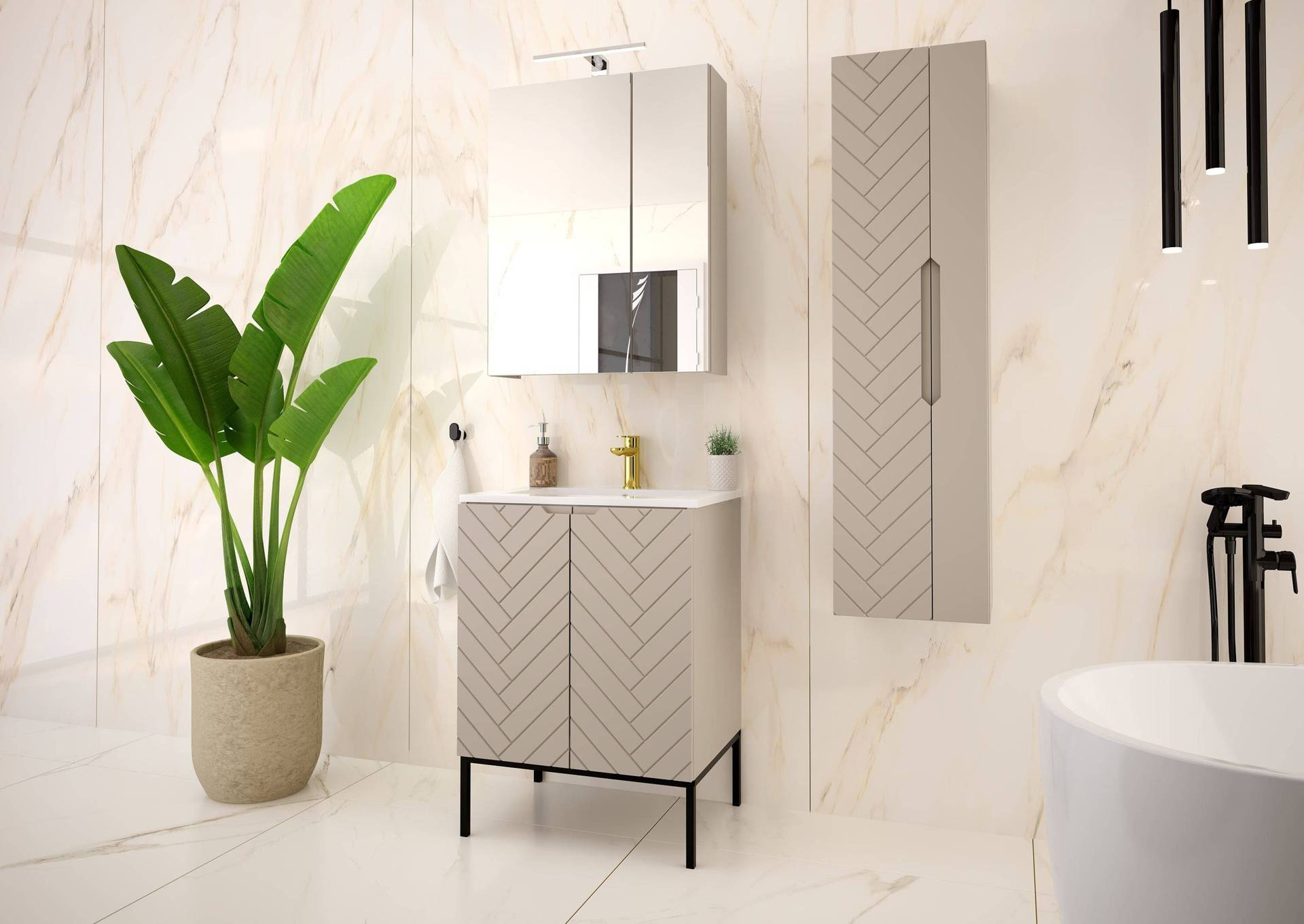 - Stylowa szafka ASPEN-09 w kolorze kaszmir z eleganckim czarnym stelażem. Wykonana z trwałej płyty MDF i laminowanej, z puszkowymi zawiasami i cichym domykaniem. Idealna do nowoczesnej łazienki. Samodzielny montaż.