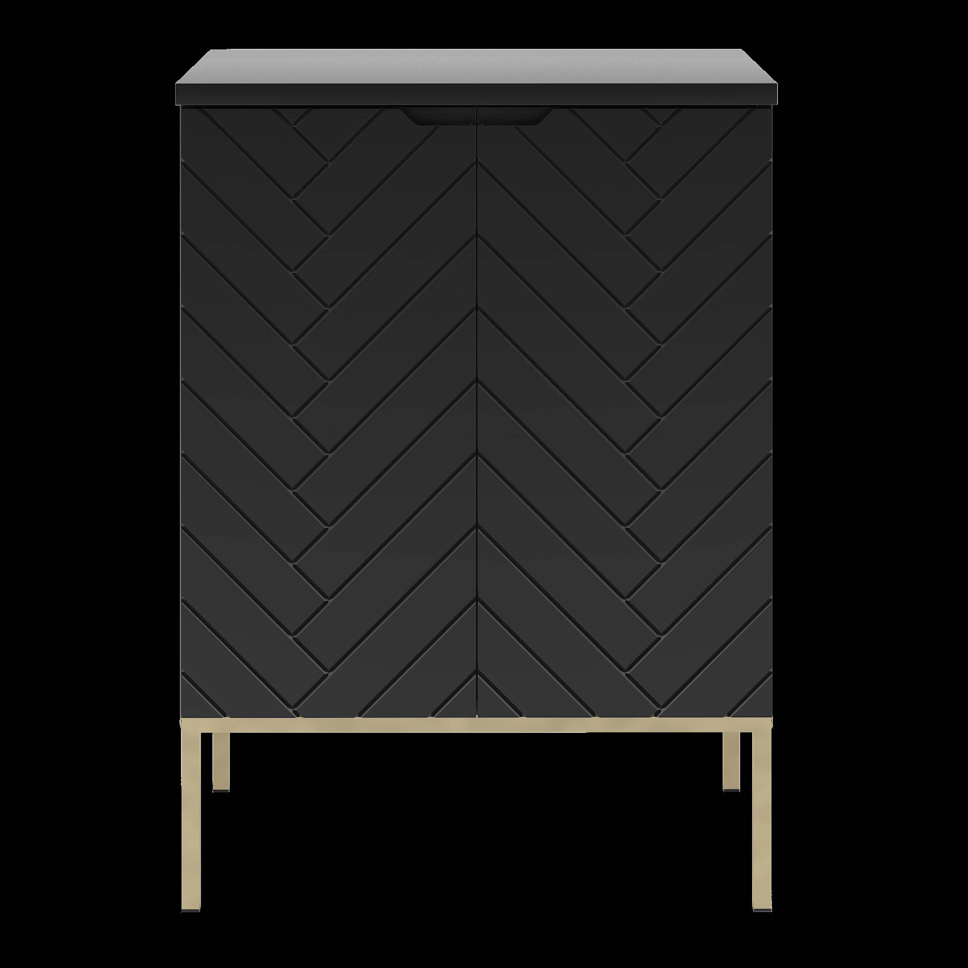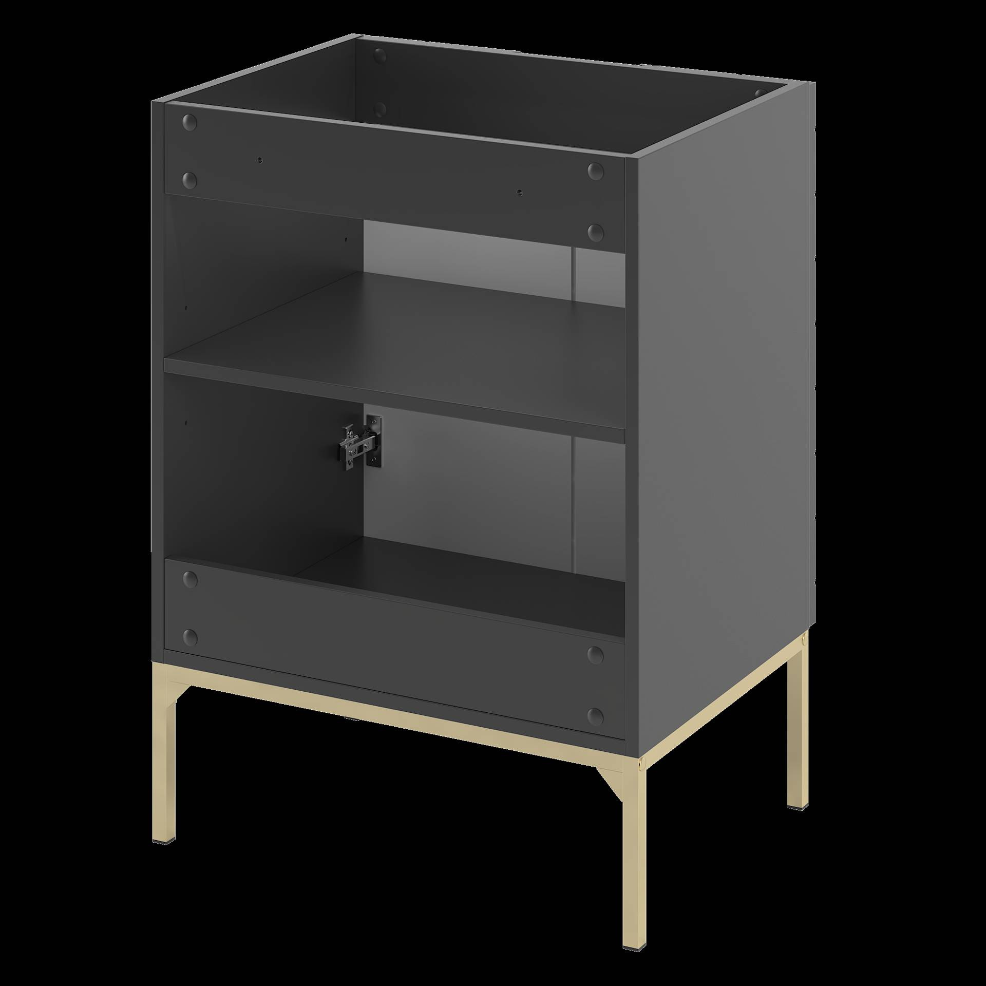Elegancka szafka ASPEN-09 marki Megstyl w kolorze czarnego matu z dwudrzwiowymi frontami z płyty MDF. Złoty metalowy stelaż dodaje luksusu, a cichy domyk zapewnia komfort użytkowania. W zestawie kompatybilny blat, idealna do nowoczesnych łazienek.