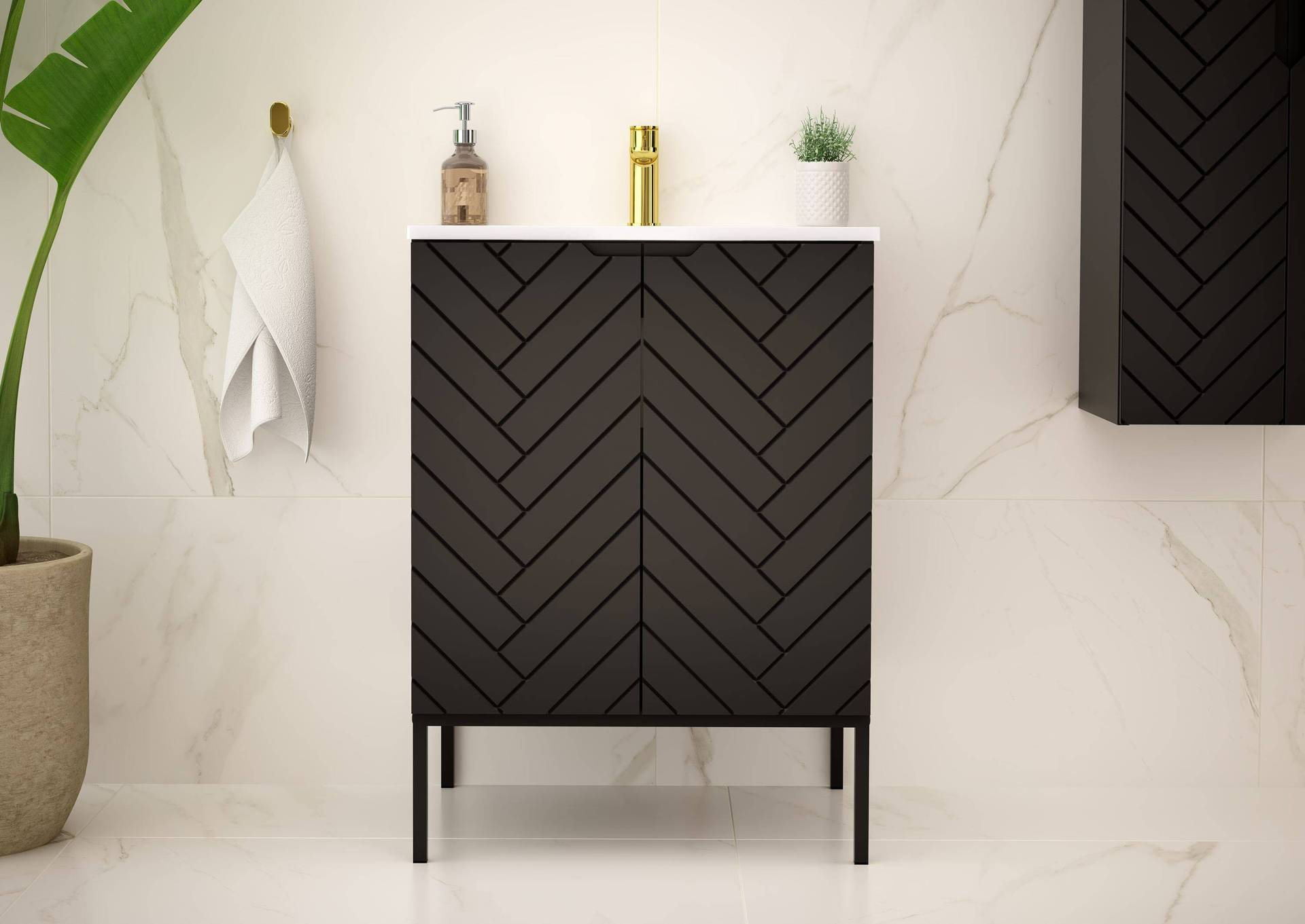 Nowoczesna szafka łazienkowa ASPEN-09 łączy elegancję i funkcjonalność. Czarny matowy front i korpus z płyty MDF i laminowanej oraz ceramiczna umywalka w białym połysku. Metalowy stelaż zapewnia trwałość, a cichy domyk komfort użytkowania.