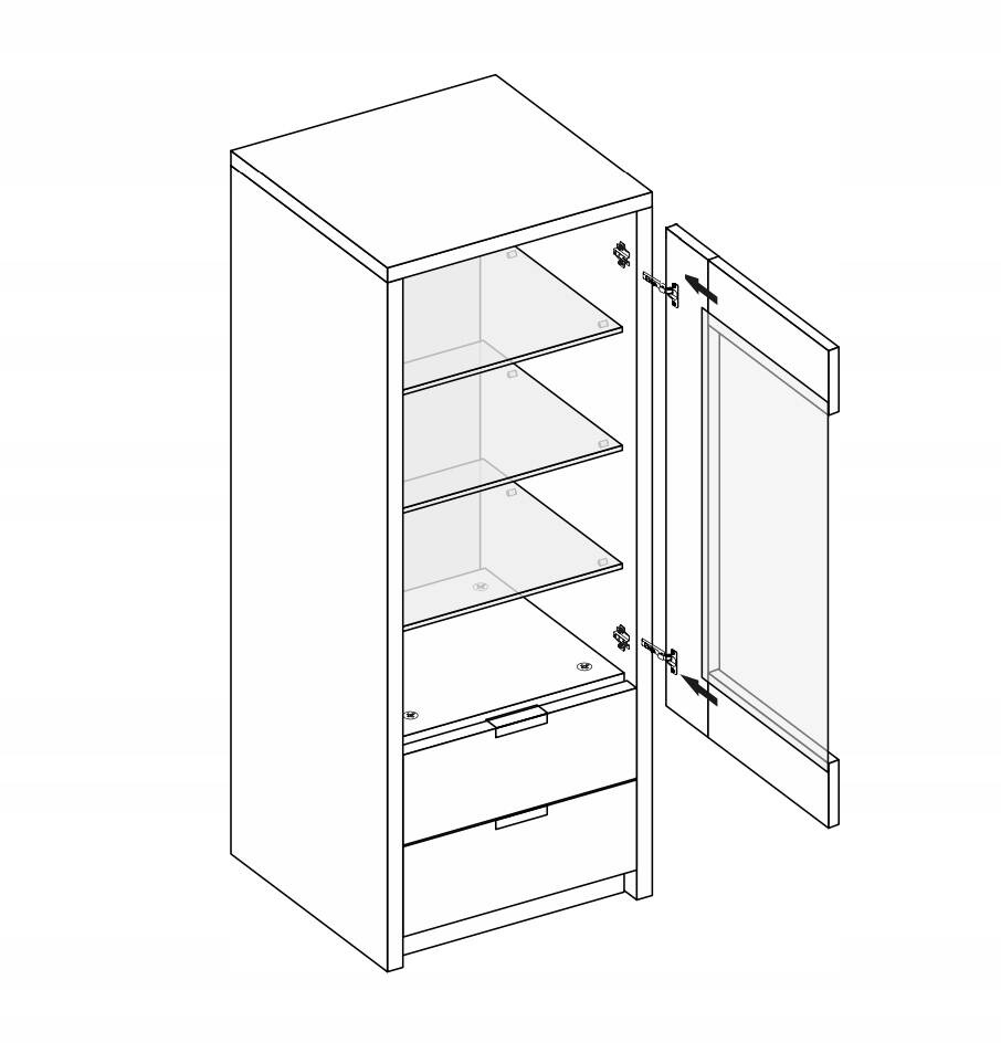 Dzięki teleskopowym prowadnicom szuflad i wzmocnionym zawiasom drzwi witryna oferuje niezrównaną wygodę użytkowania. Przekłada się to na swobodę organizacji przestrzeni wewnętrznej oraz zapewnia bezpieczne magazynowanie przedmiotów. Dodatkowo możliwość montażu drzwi z otwieraniem na lewą lub prawą stronę zwiększa uniwersalność tego mebla, pozwalając na lepsze dopasowanie do różnorodnych wnętrz i potrzeb użytkownika.