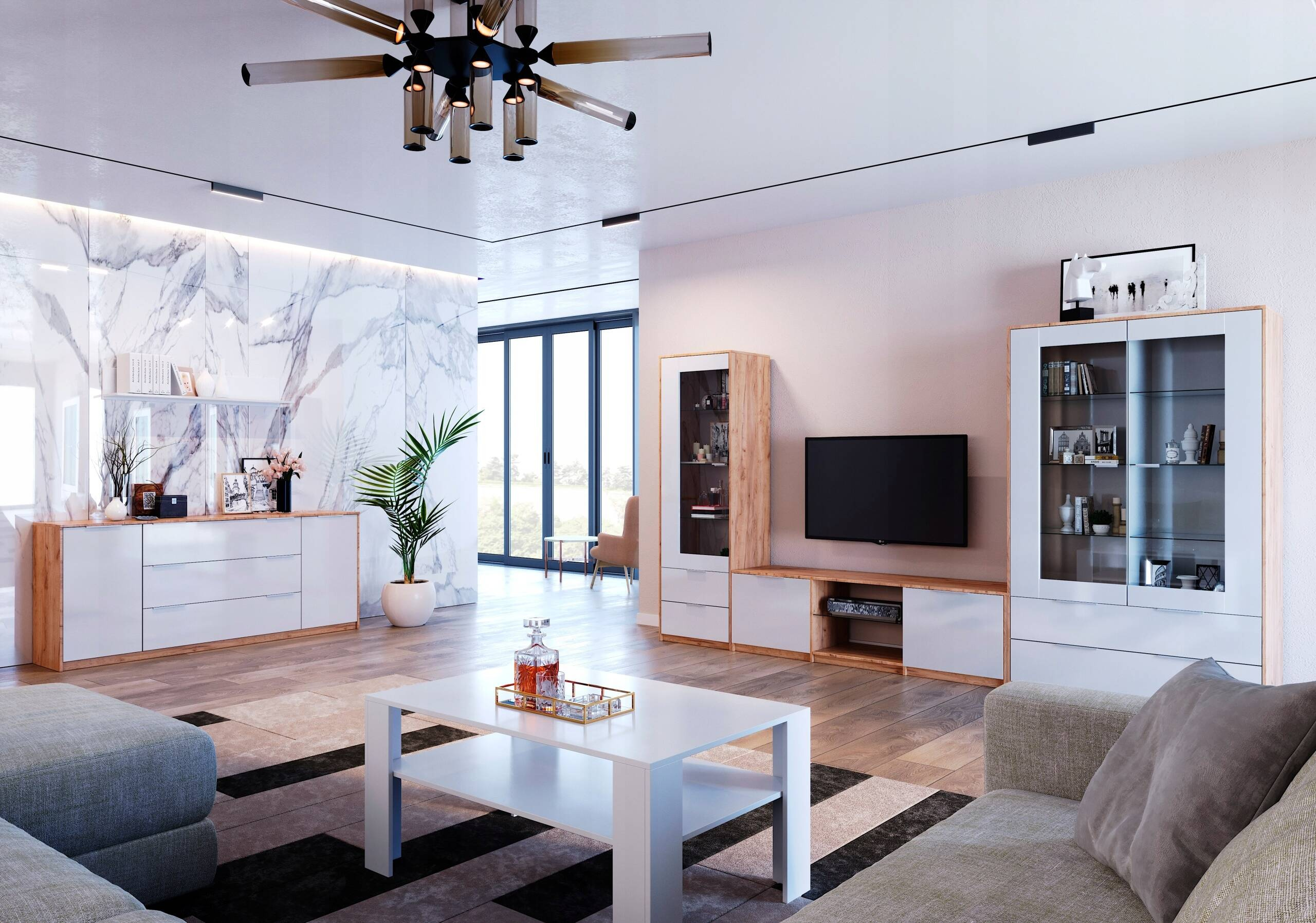 Witryna Asti AS-111-WB marki MiroMark zachwyca elegancją i funkcjonalnością. Wykonana z laminowanej płyty w odcieniu Dąb Craft Biały połysk, łączy matowe i błyszczące wykończenia. Szklane półki i teleskopowe szuflady dodają wyrafinowania.