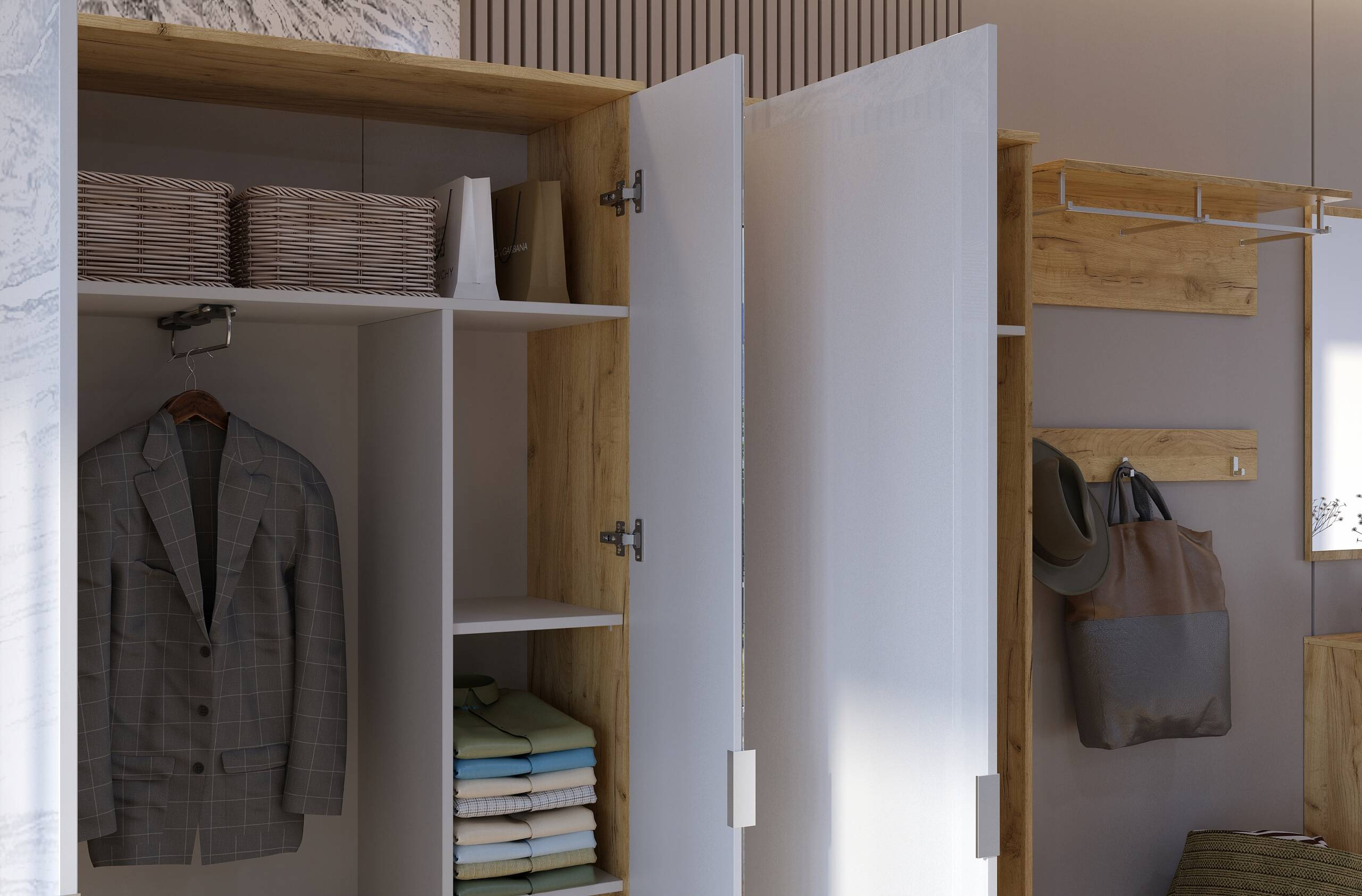Szafa Asti AS-122-WB to także praktyczne rozwiązania przechowywania. Dzięki różnym poziomom półek i wieszakom, bez problemu pomieścisz wszystkie niezbędne ubrania i akcesoria. Stylowe uchwyty aluminiowe dodają elegancji i sprawiają, że otwieranie i zamykanie drzwi jest wyjątkowo wygodne.