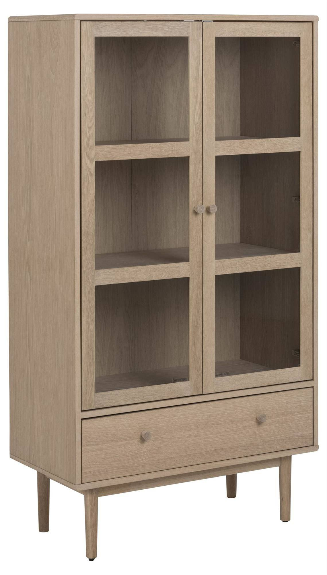 Materiały i wykończenie: Korpus witryny stworzono z płyty fornirowanej dębowej, z zachowaniem naturalnej tekstury drewna. Fornir dębowy, olejowany bielony, nie tylko eksponuje piękno słoju, ale dodatkowo jest trwały i odporny. Podstawa z litego dębu i zastosowanie olejowania zapewniają wyjątkową trwałość i wygodę użytkowania.