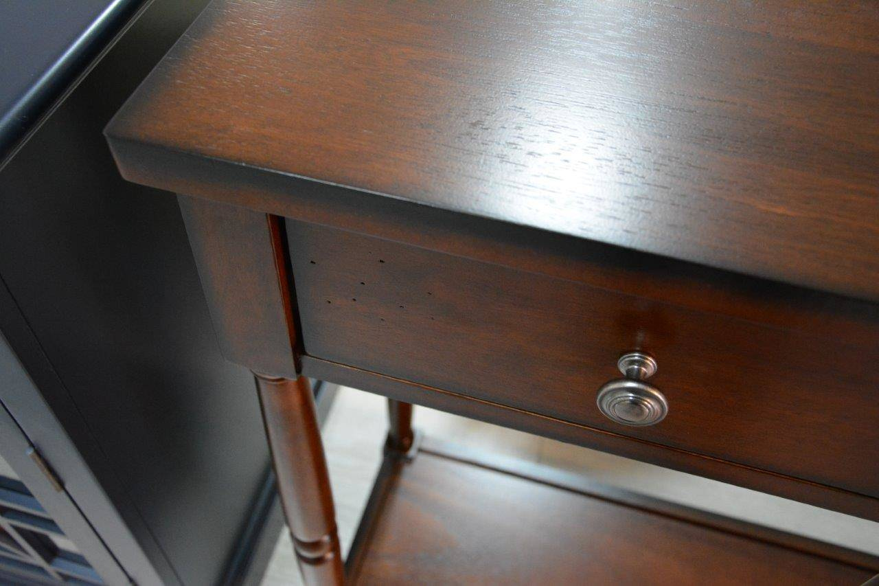 • Stylowa konsola o szerokości 152 cm z eleganckimi okrągłymi uchwytami, jedną półką i toczonymi nogami. Wykonana z drewna kauczukowca, kolor antyczna biel.