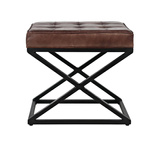 - Pikowane siedzisko w stylu industrialnym z metalowymi nogami w kształcie X z tapicerką ze skóry naturalnej w kolorze ciemnobrązowym.