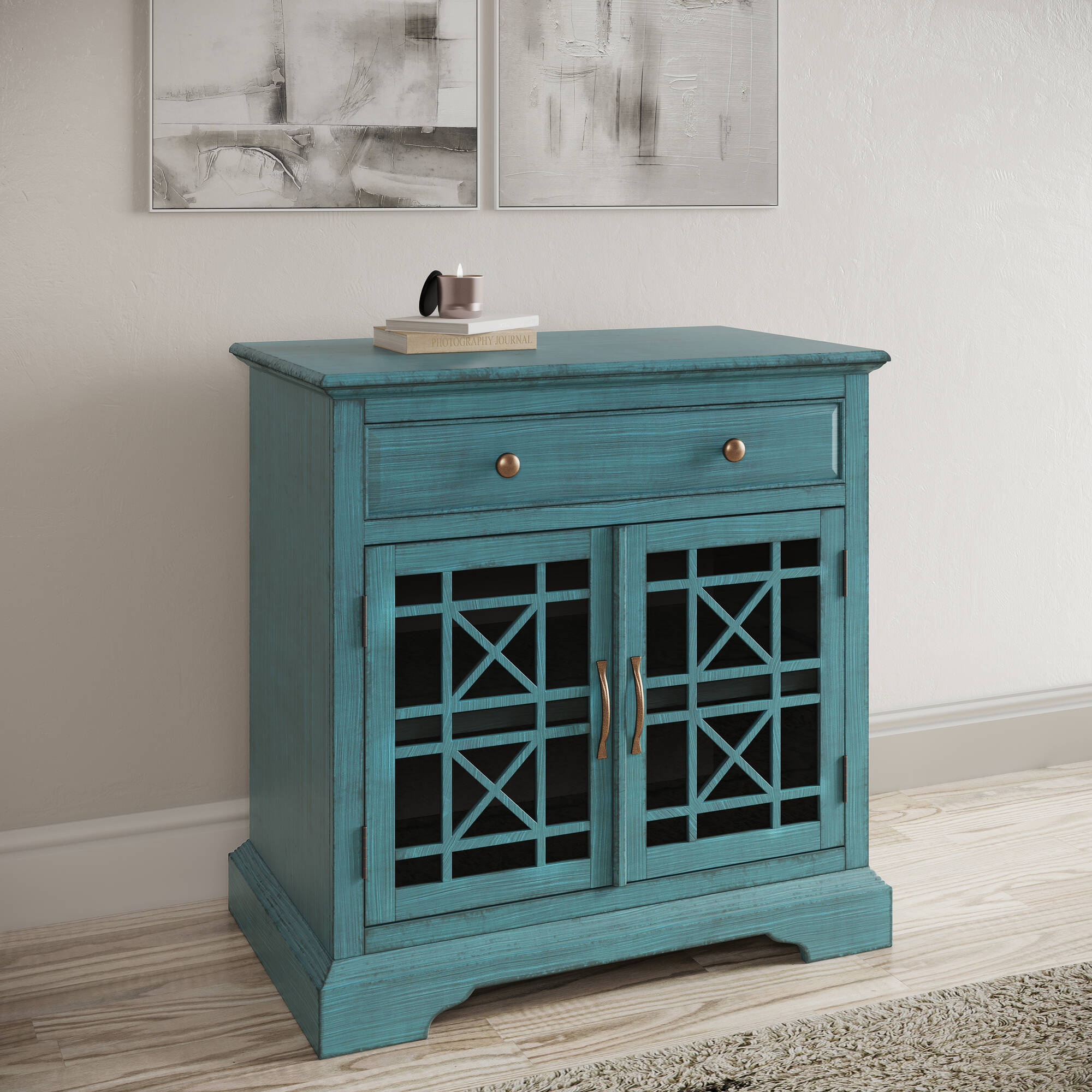 - Komoda z dwojgiem przeszklonych ażurowych drzwiczek, z jedną szufladą i jedną półką. Wykonana z drewna i MDF-u w kolorze ciemnoniebieskim z eleganckimi uchwytami w kolorze starego mosiądzu.