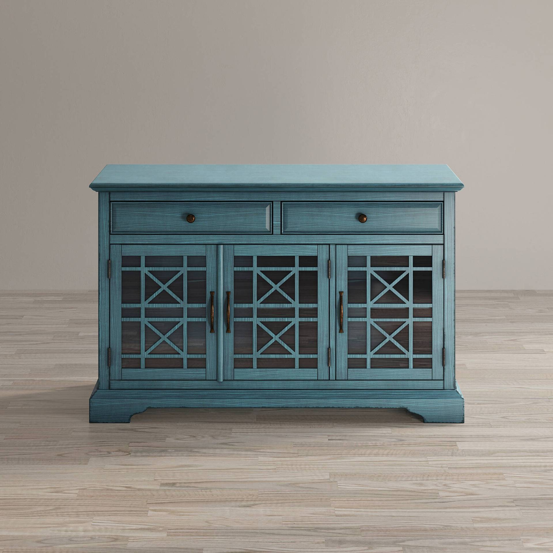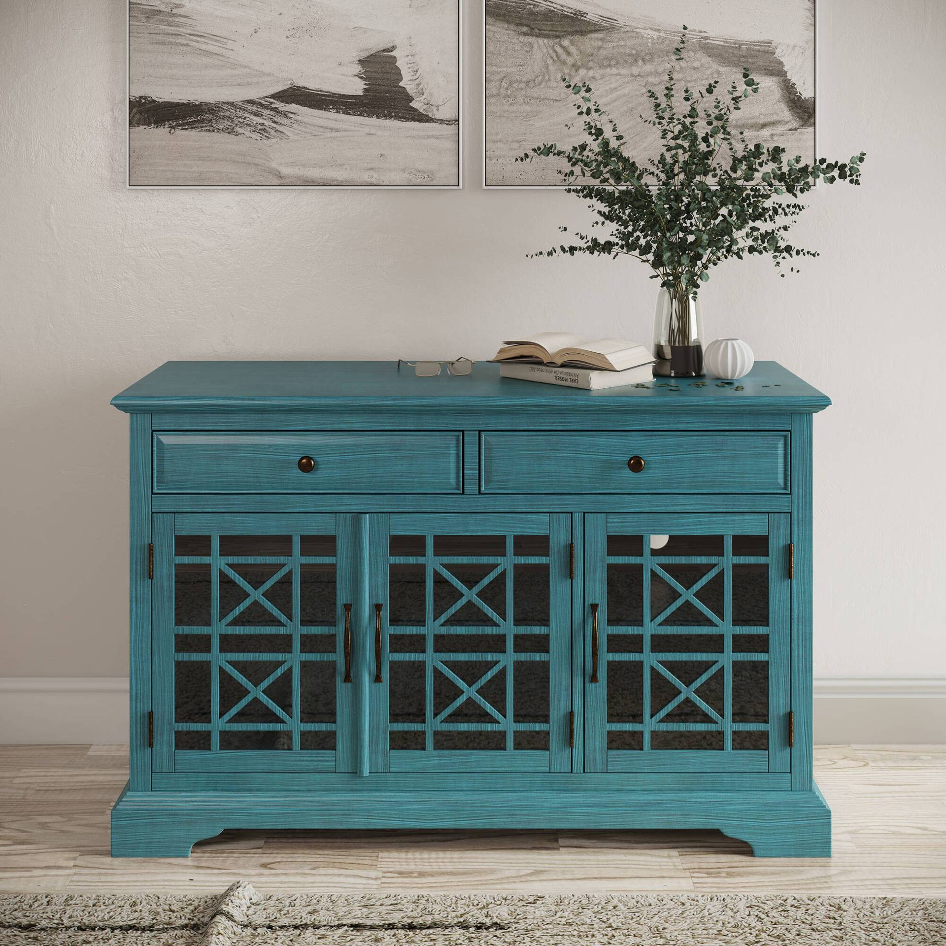 • Komoda z trojgiem przeszklonych ażurowych drzwiczek, z dwiema szufladami i dwiema półkami. Wykonana z drewna i MDF-u w kolorze ciemnoniebieskim z eleganckimi uchwytami w kolorze starego mosiądzu.