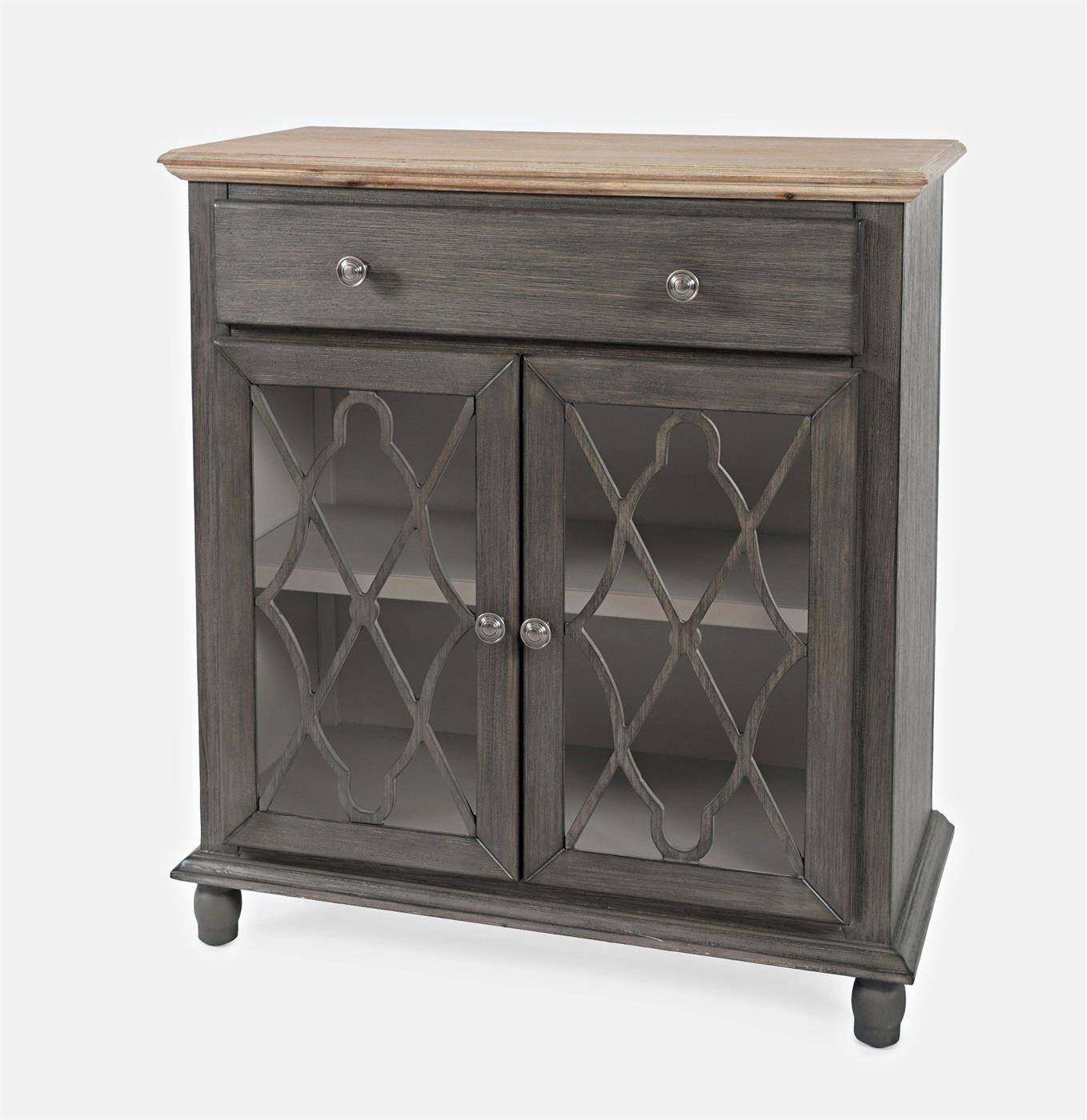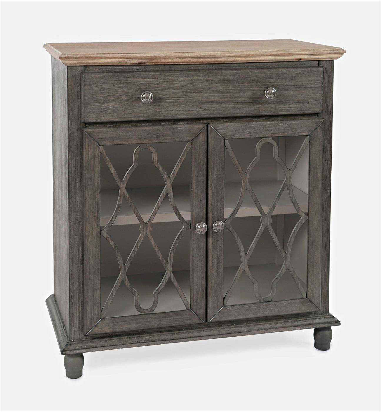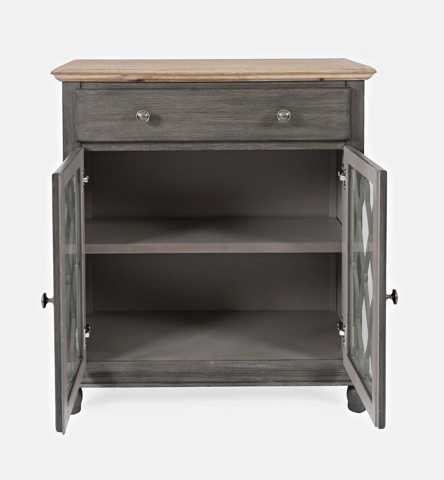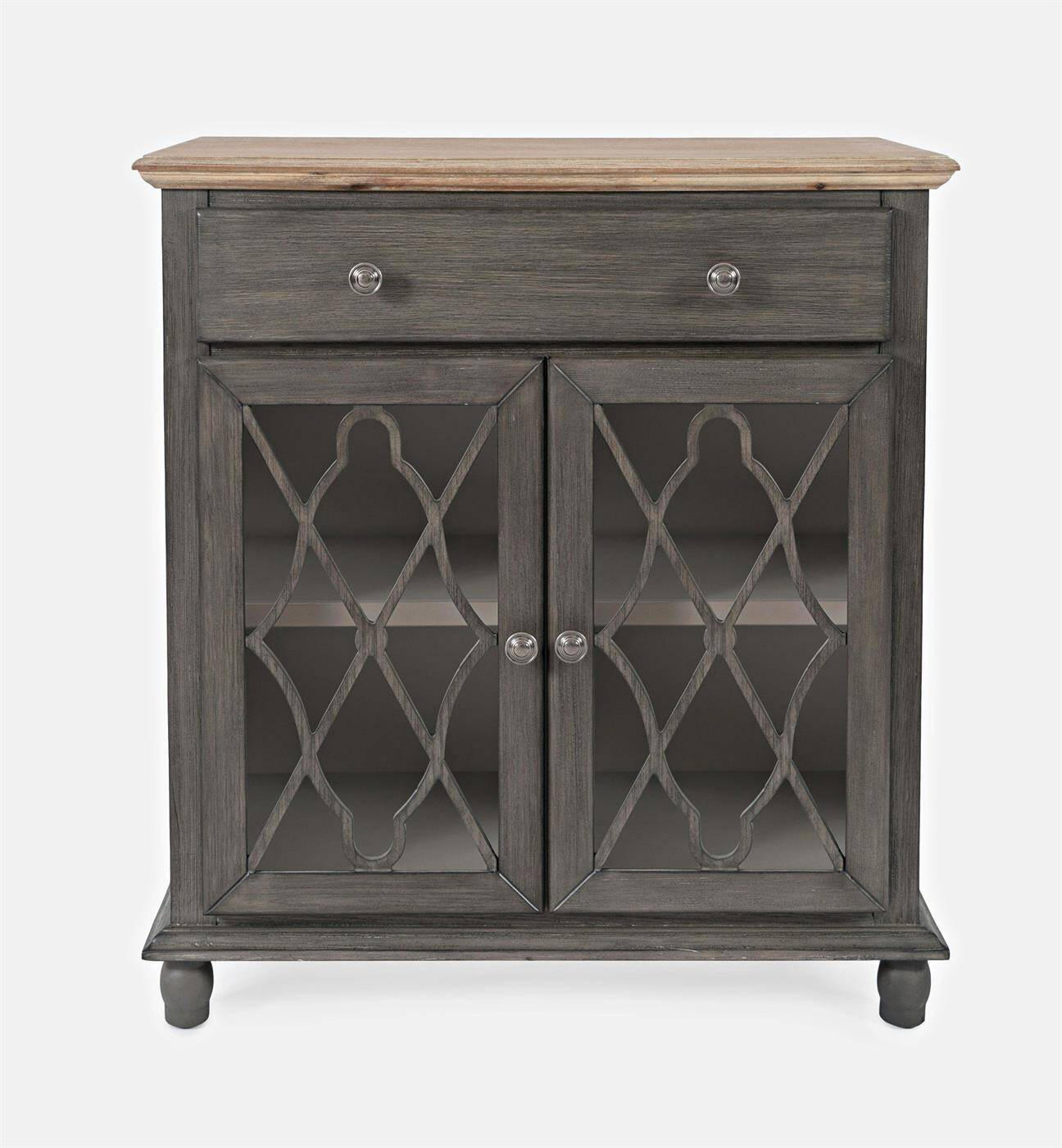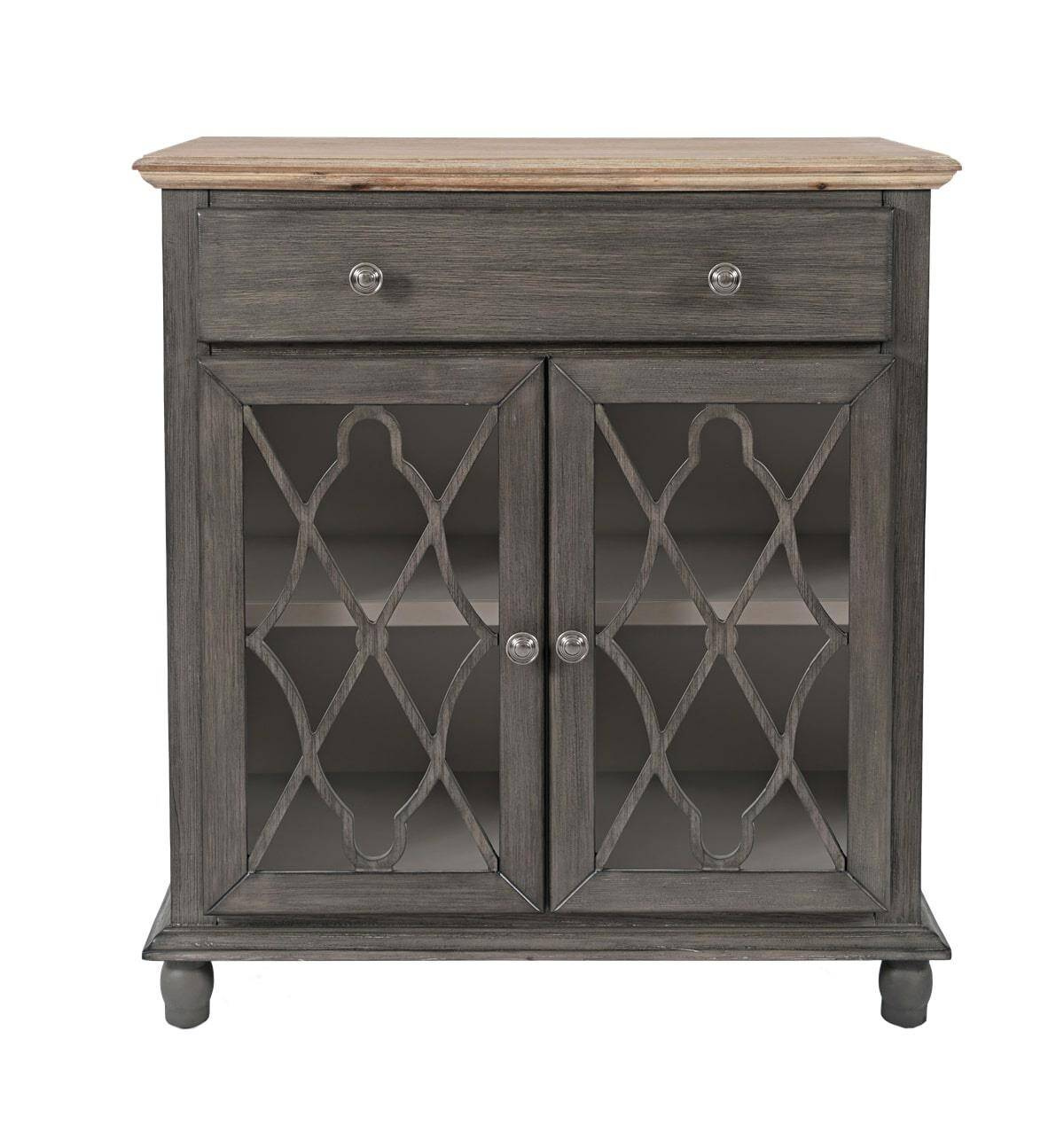 - Komoda wykonana z drewna akacji i MDF-u z jedną szufladą i jedną półką w kolorze szaro-brązowym z jasnobrązowym blatem i przeszklonymi ażurowymi drzwiami.