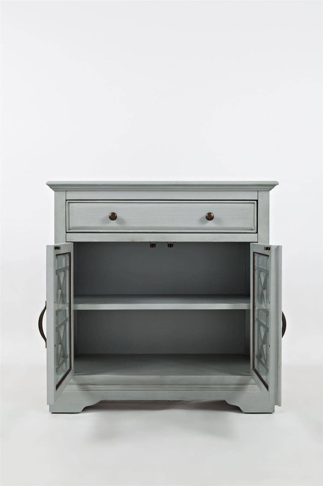 - Komoda z dwojgiem przeszklonych ażurowych drzwiczek, jedną szufladą i jedną półką. Wykonana z drewna akacji i MDF-u w kolorze szaro-miętowym z eleganckimi metalowymi uchwytami. Styl prowansalski, rustykalny.