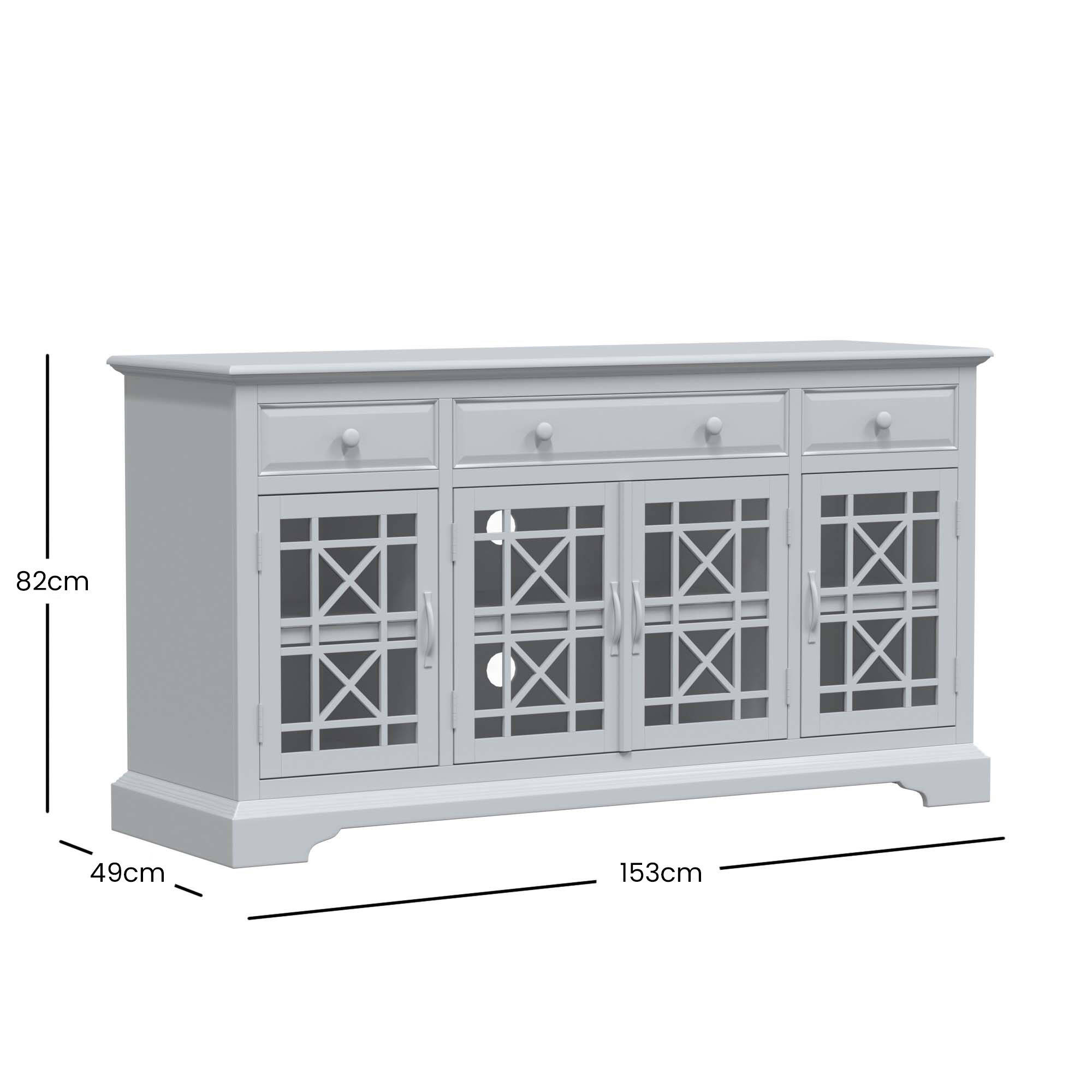 - Komoda z czworgiem przeszklonych ażurowych drzwiczek, z trzema szufladami i trzema półkami w kolorze ciemnogranatowym z eleganckimi srebrnymi uchwytami. Wykonana z drewna akacji i MDF-u w stylu prowansalskim, rustykalnym, vintage.