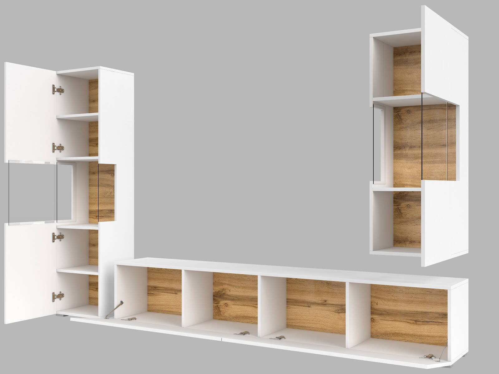 Meblościanka Ava w kolorze biało-dębowym to połączenie funkcjonalności i nowoczesnego designu. Bezuchwytowe drzwi z systemem push-to-open i możliwość montażu stojąco lub wiszącego dodają elegancji każdemu wnętrzu.