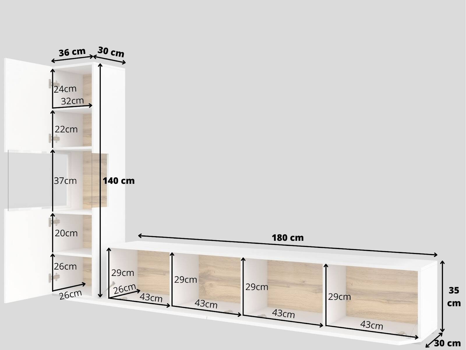 - Elegancka meblościanka Ava w kolorze czarnym i dębu Wotan, z bezuchwytowym systemem 'push to open' i możliwością zawieszenia. W zestawie szafka RTV i przeszklona witryna z 4 półkami, wykończone metalowymi okuciami.