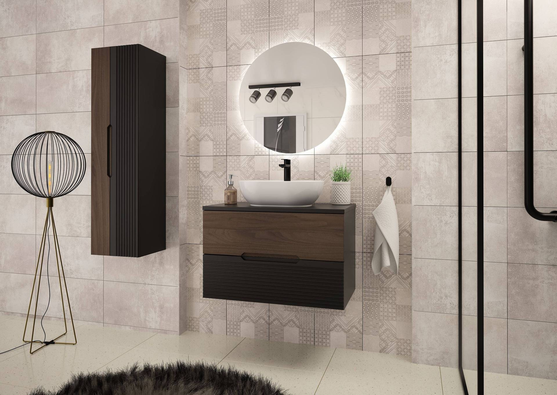 Kolekcja AVELLA to kwintesencja nowoczesnego designu, który łączy w sobie elegancję i funkcjonalność. Szafka z umywalką i blatem o szerokości 80 cm zachwyca klasycznym połączeniem czarnego matu i ciepłego odcienia orzecha. Dzięki temu zestawienie świetnie wpisuje się w każde wnętrze, dodając mu wyrafinowanego charakteru.