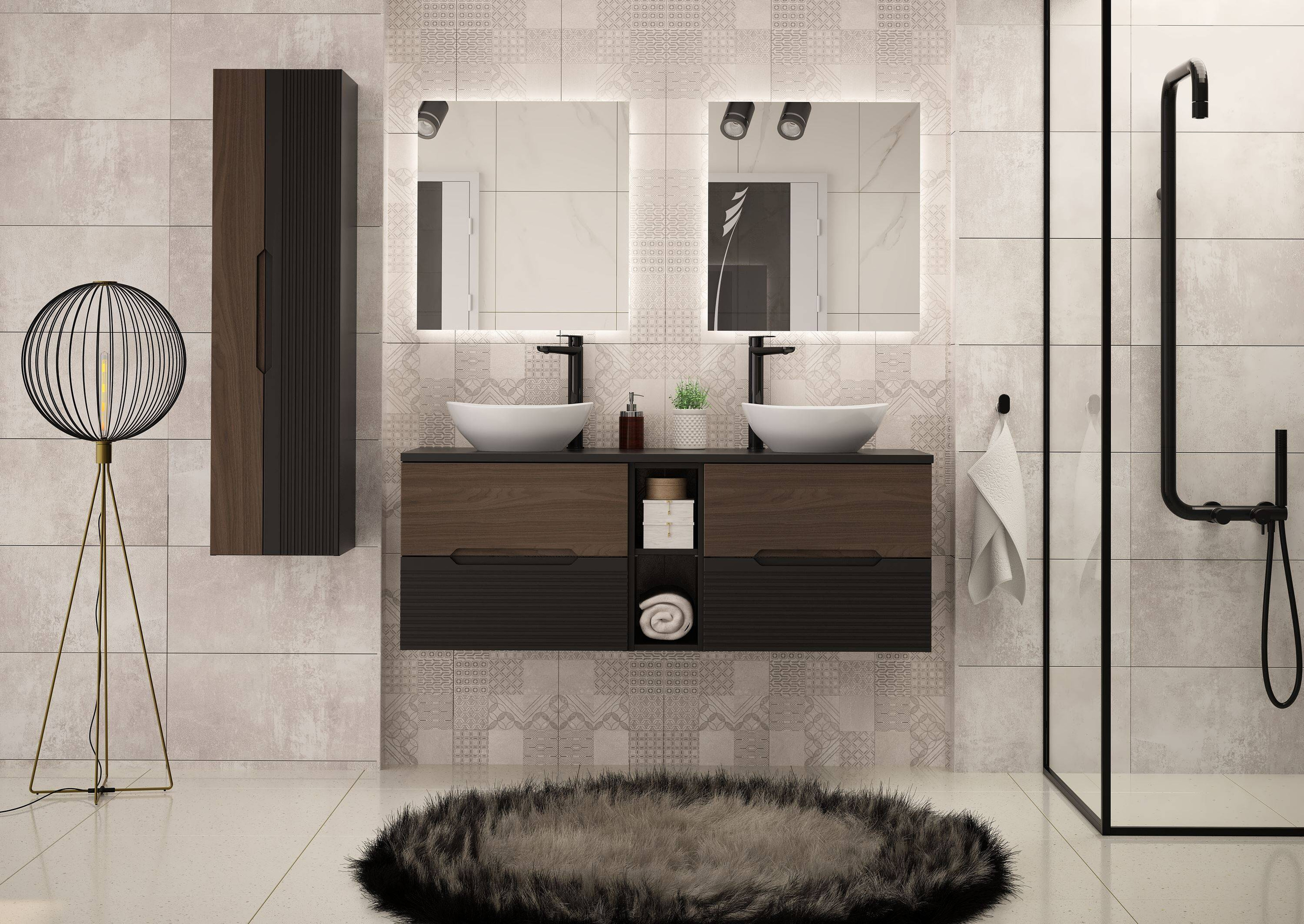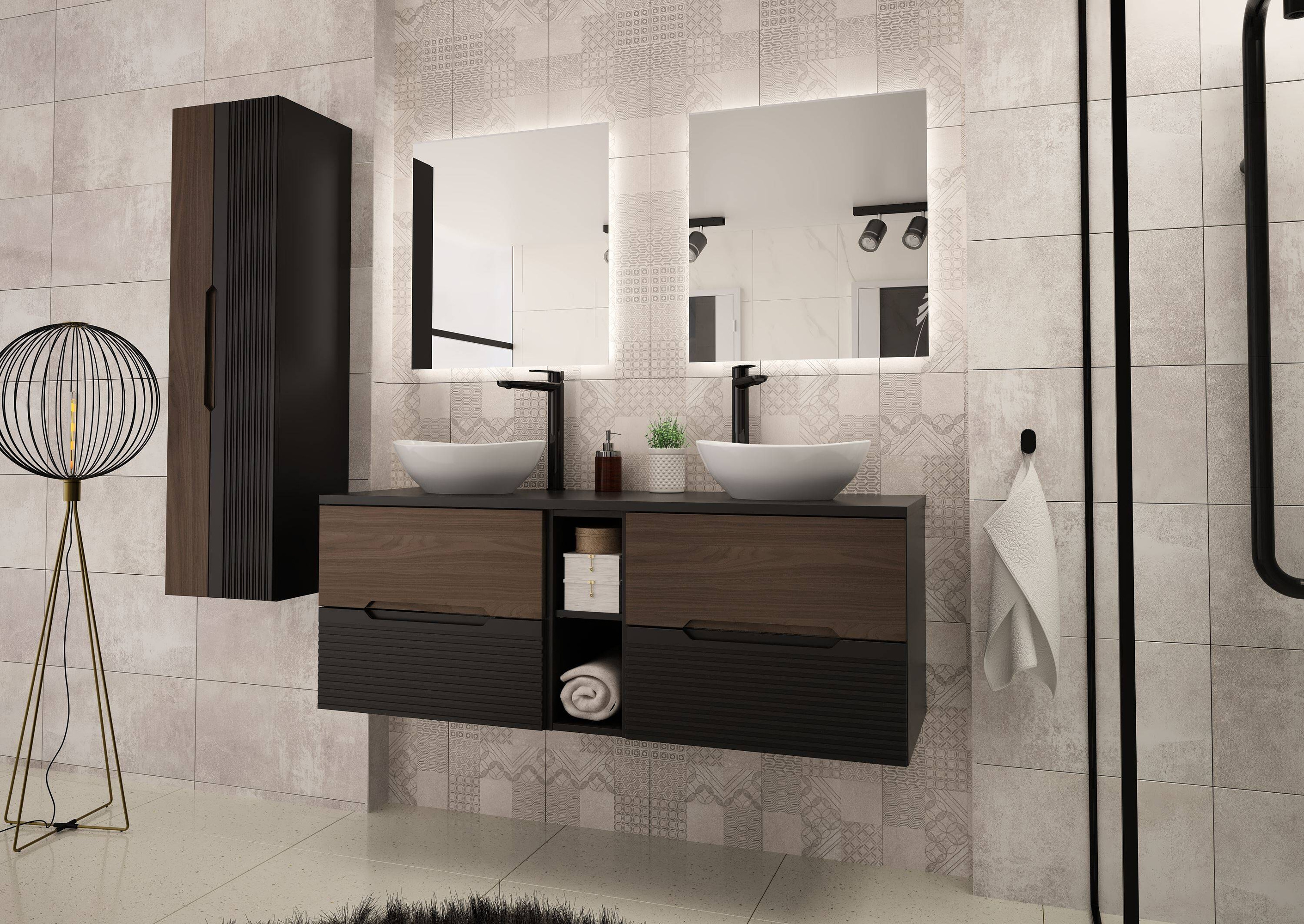 Szafka AVELLA-02 to nie tylko mebel, ale prawdziwy klejnot w Twojej łazience. Elegancki design łączy nowoczesne kształty z uniwersalną estetyką, która doskonale wpasuje się w różnorodne aranżacje wnętrz. Czarny mat to kolor, który dodaje przestrzeni luksusu i wyrafinowanej klasy, podczas gdy akcenty w kolorze orzecha wprowadzają ciepło i naturalny charakter.