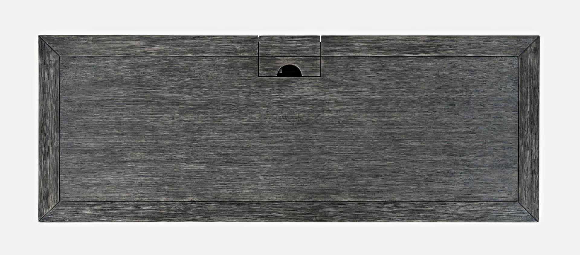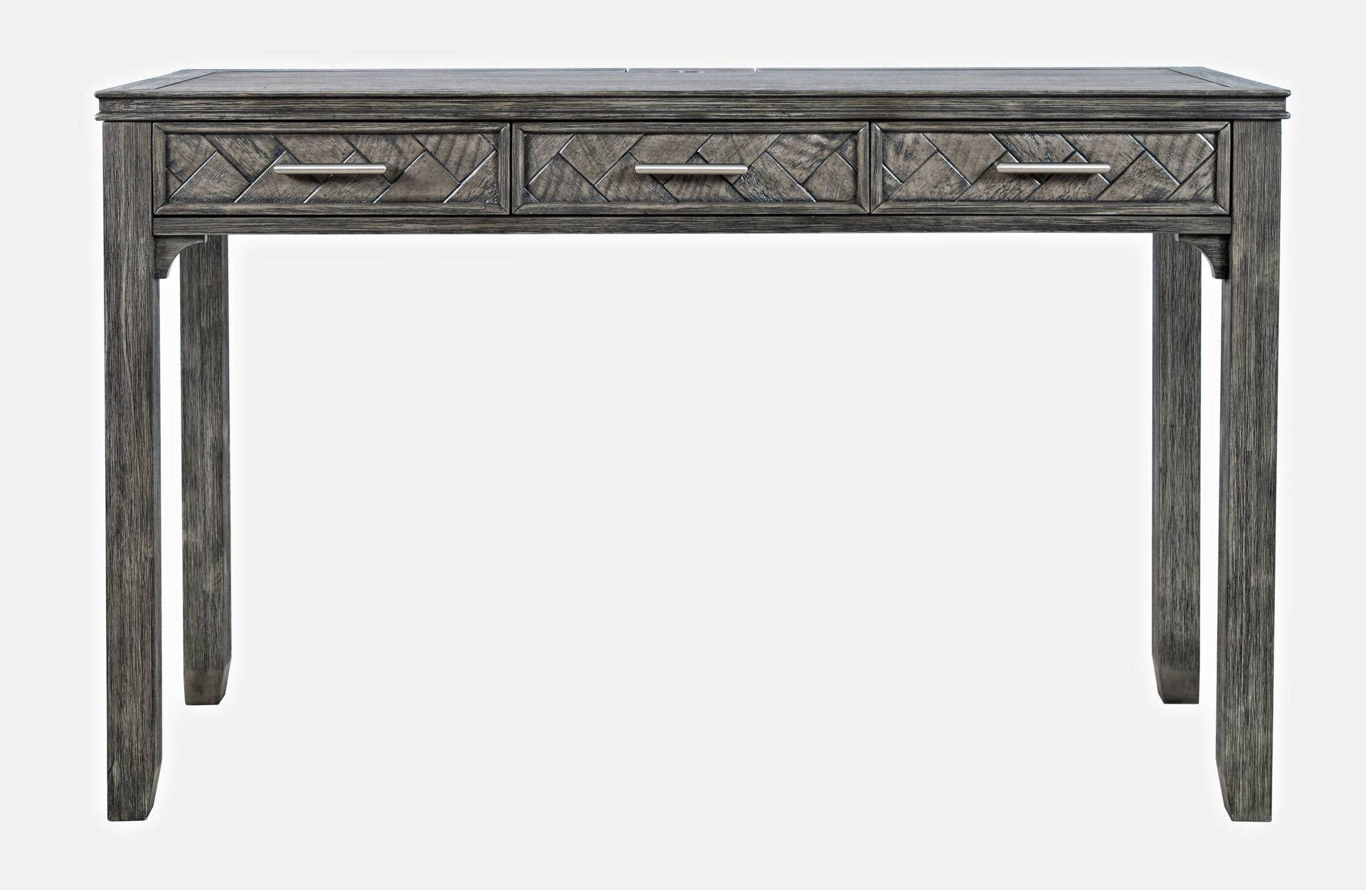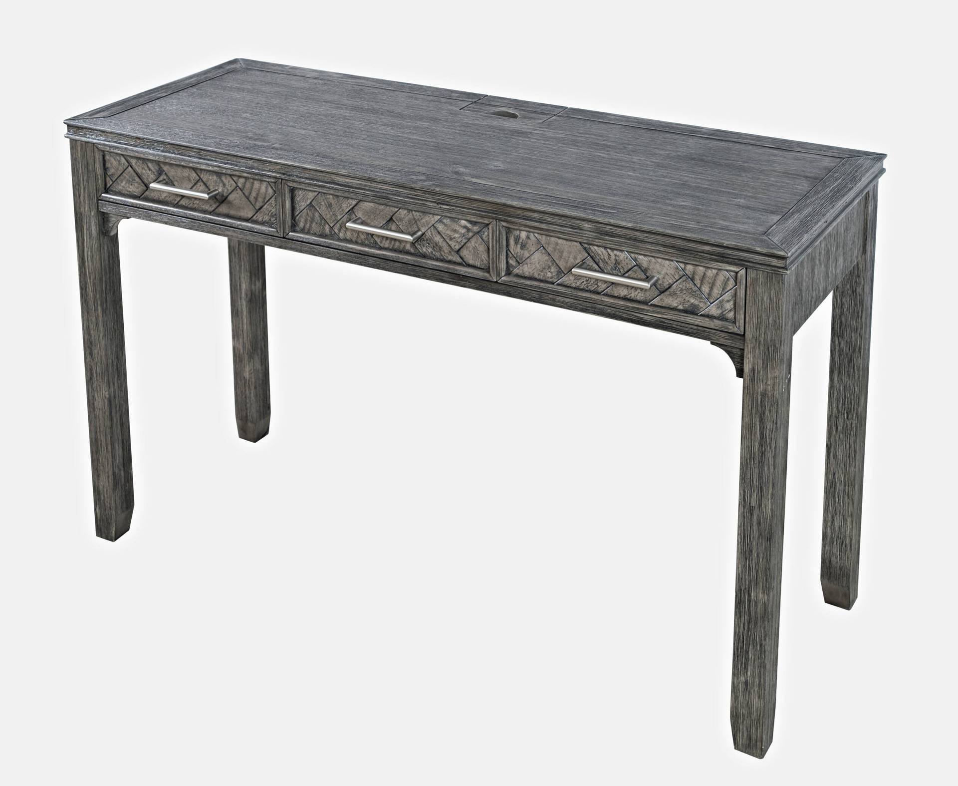 - Klasyczne biurko o szerokości 122 cm w kolorze szaro-brązowym z trzema funkcjonalnymi szufladami z intarsją wykonane z drewna akacji. Posiada wygodne metalowe uchwyty, wbudowane gniazdo i porty USB.