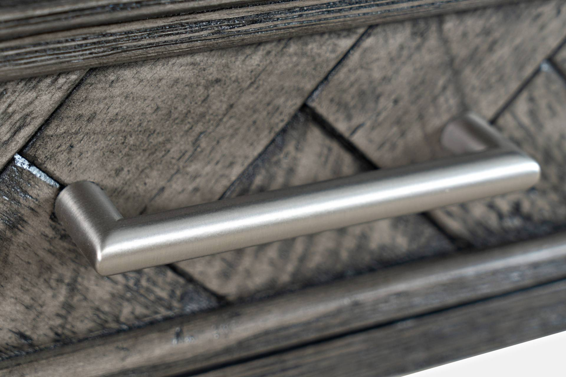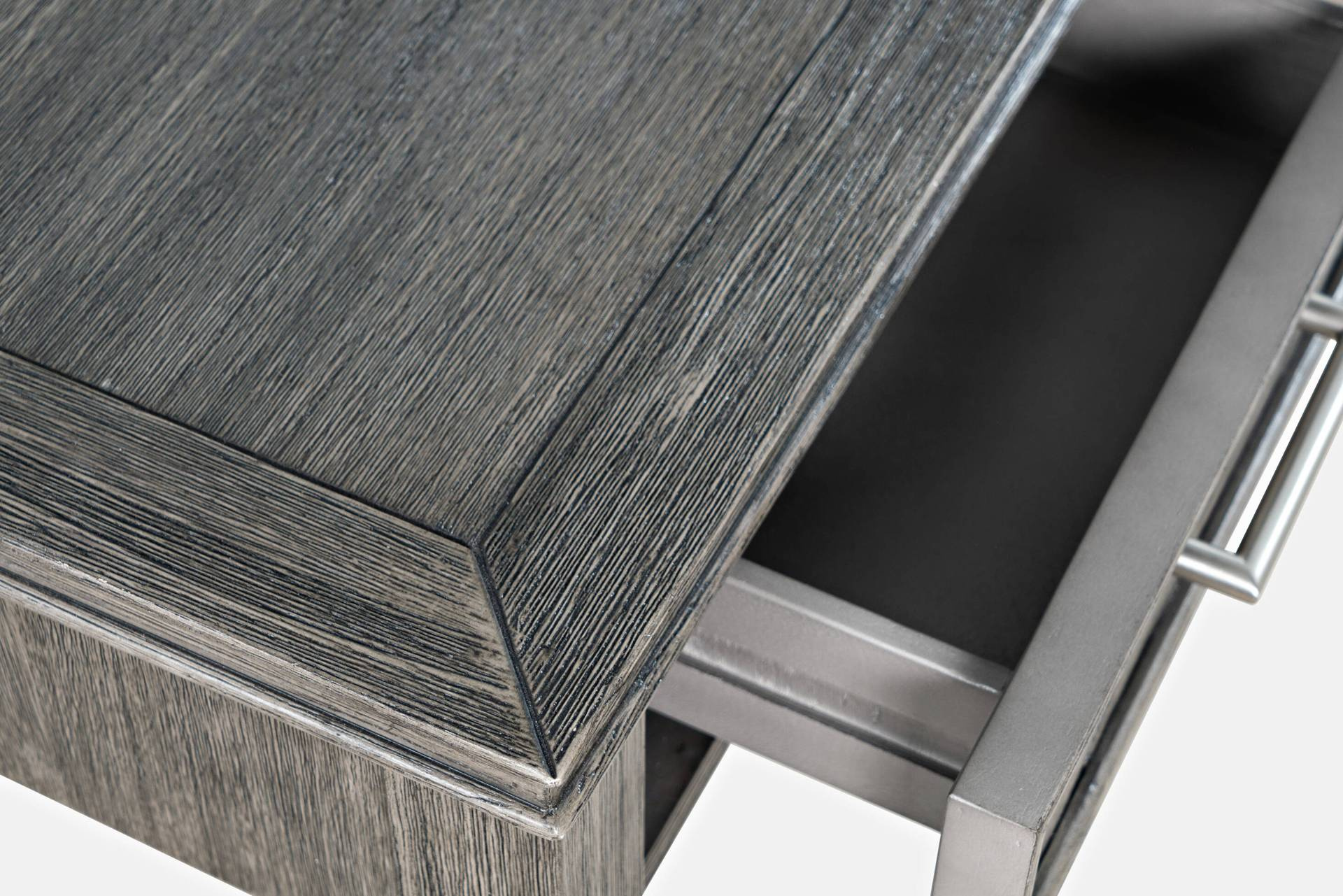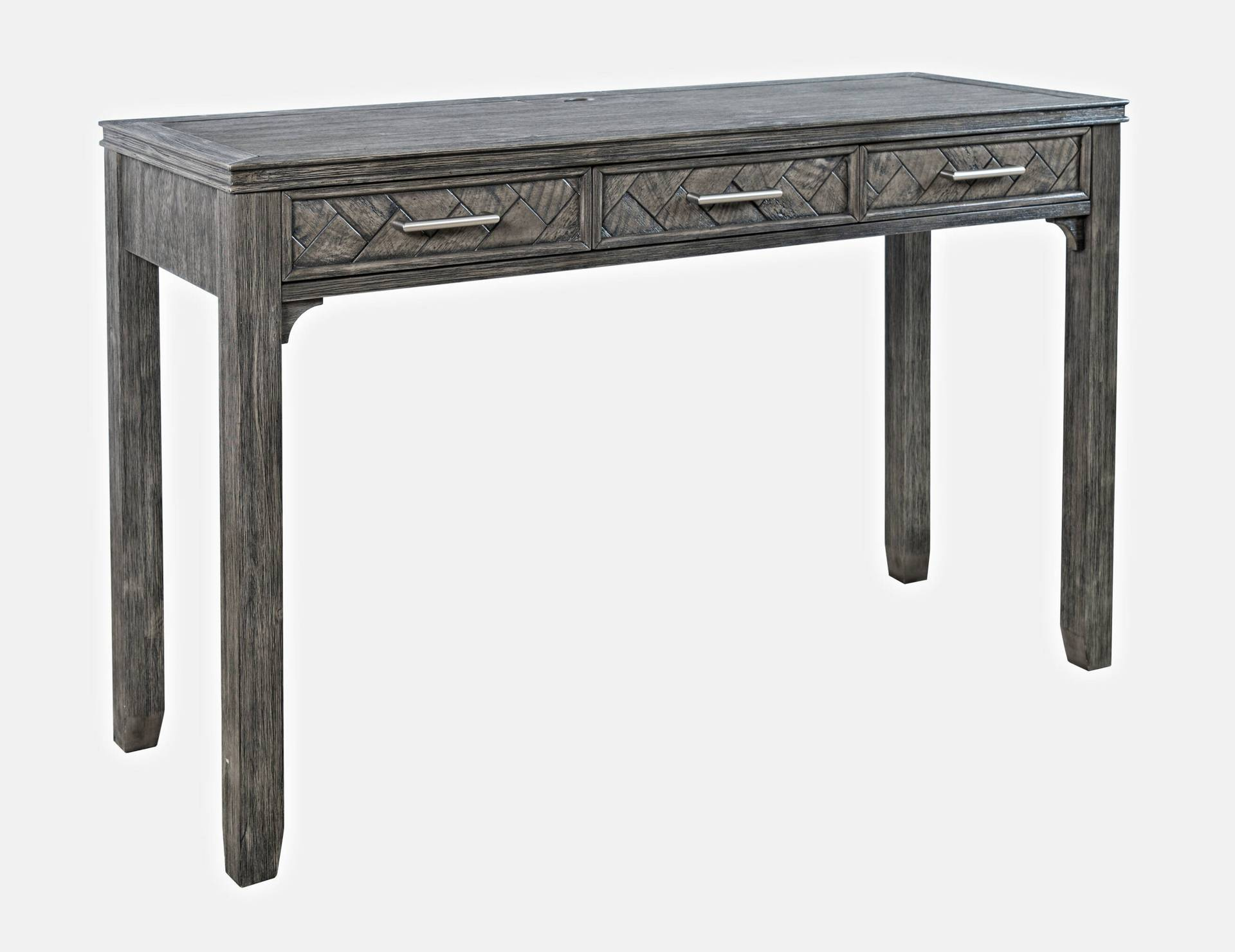 - Klasyczne biurko o szerokości 122 cm w kolorze szaro-brązowym z trzema funkcjonalnymi szufladami z intarsją wykonane z drewna akacji. Posiada wygodne metalowe uchwyty, wbudowane gniazdo i porty USB.