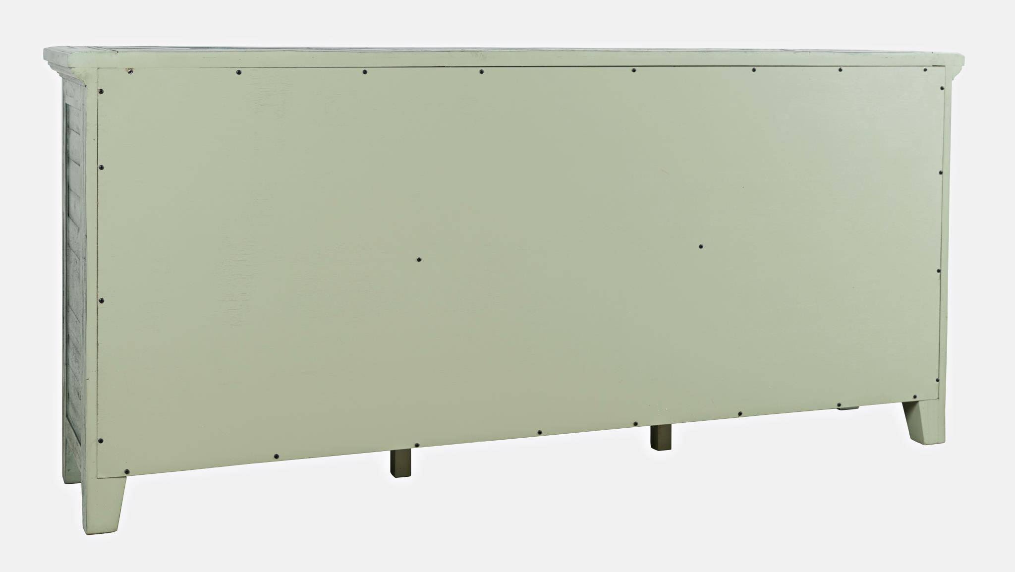 - Komoda o szerokości 178 cm z sześciorgiem przeszklonych drzwiczek i trzema półkami w kolorze turkusowo- miętowym. Komoda posiada oryginalnie wyglądające postarzenia w stylu rustykalnym oraz ozdobne listewki.