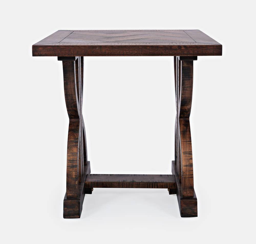 - Masywny i stabilny stolik wykonany z naturalnego drewna akacji w kolorze ciemnobrązowym. Blat w kształcie kwadratu z intarsją.