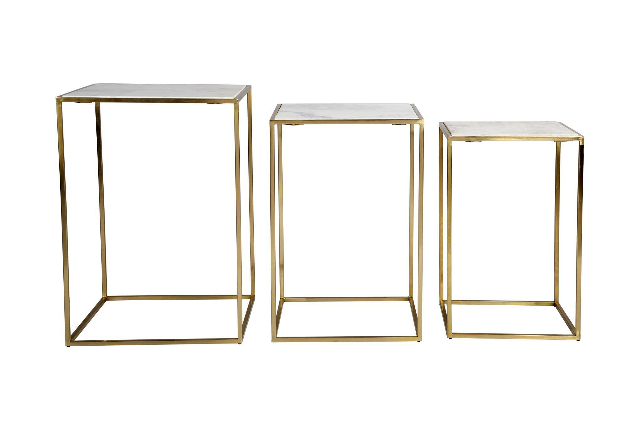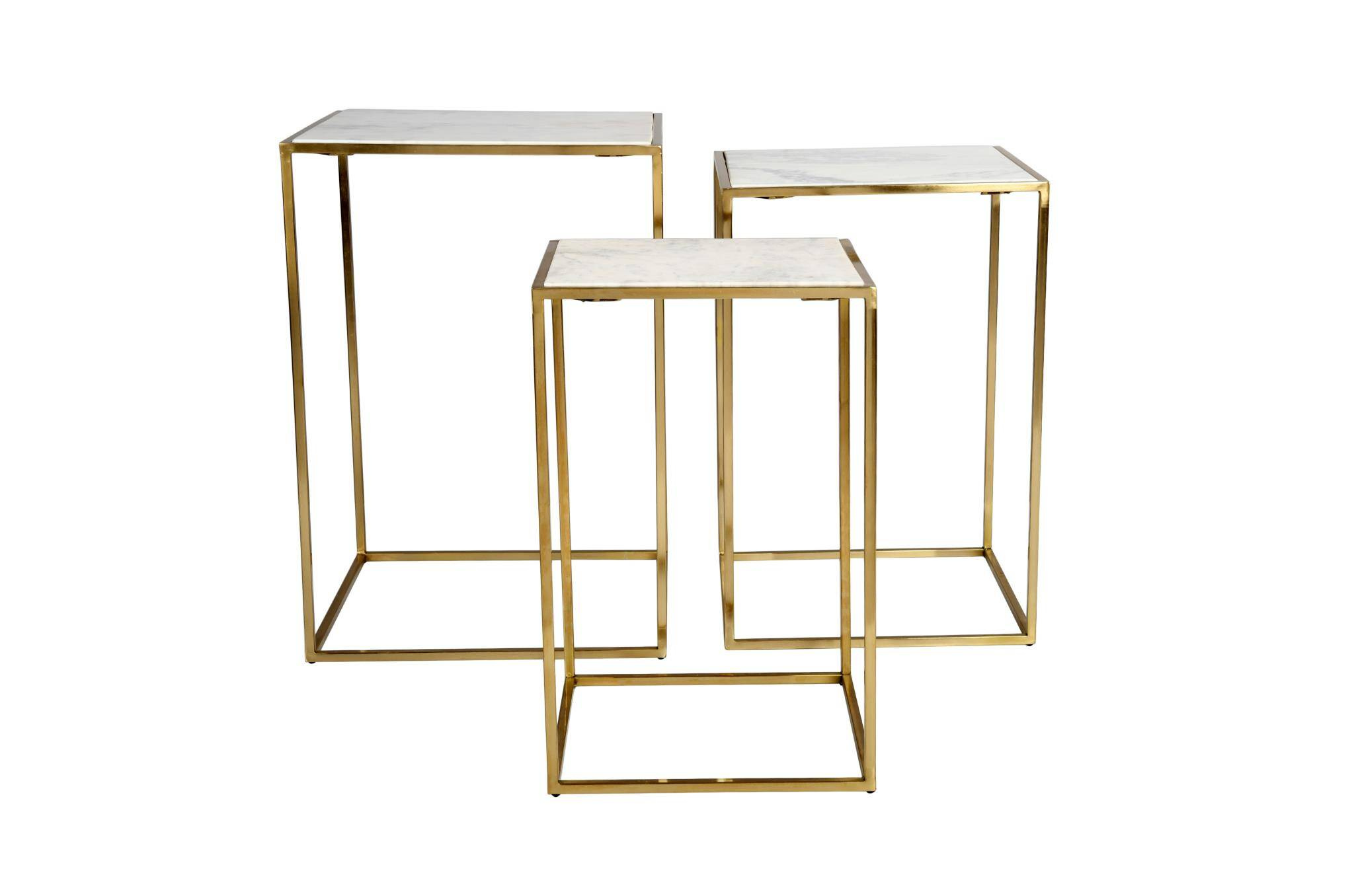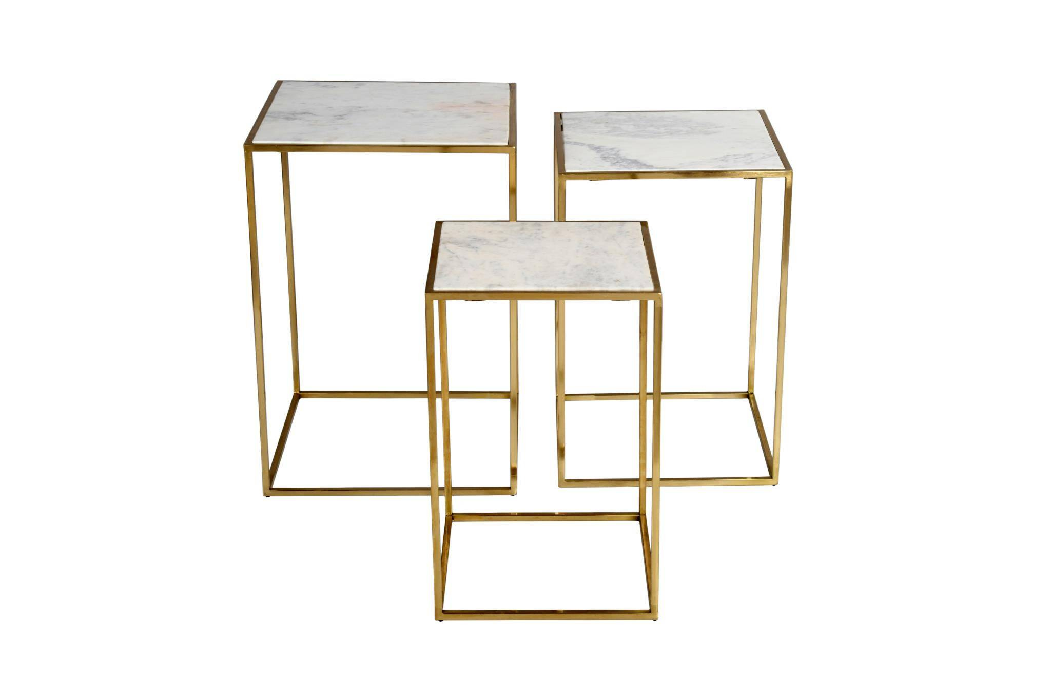 Zestaw stolików Avola od Livinhill z naturalnym, marmurowym blatem w białym kolorze i złotą, metalową podstawą. Elegancki design, funkcjonalność i możliwość złożenia stolików w jedną bryłę sprawiają, że to idealne rozwiązanie do nowoczesnego wnętrza.