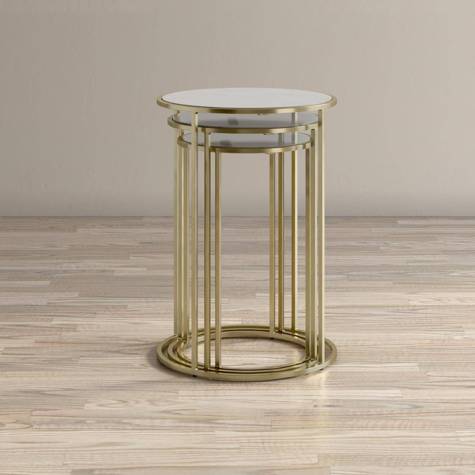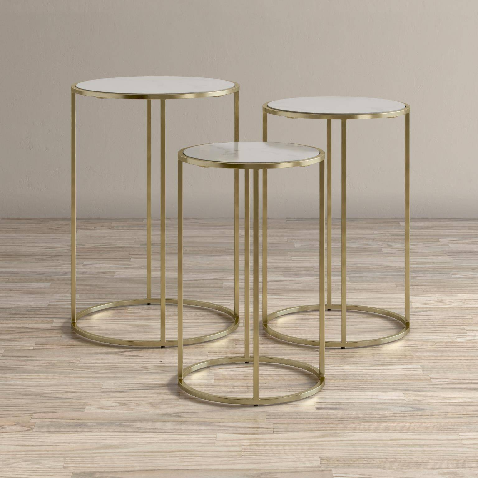 Elegancki zestaw stolików Livinhill Avola AV2130-39. Białe, marmurowe blaty dodają luksusu, a złote, metalowe podstawy o okrągłym kształcie zapewniają stabilność. Praktyczne rozwiązanie – mniejsze stoliki można schować w największym. Idealne do nowoczesne
