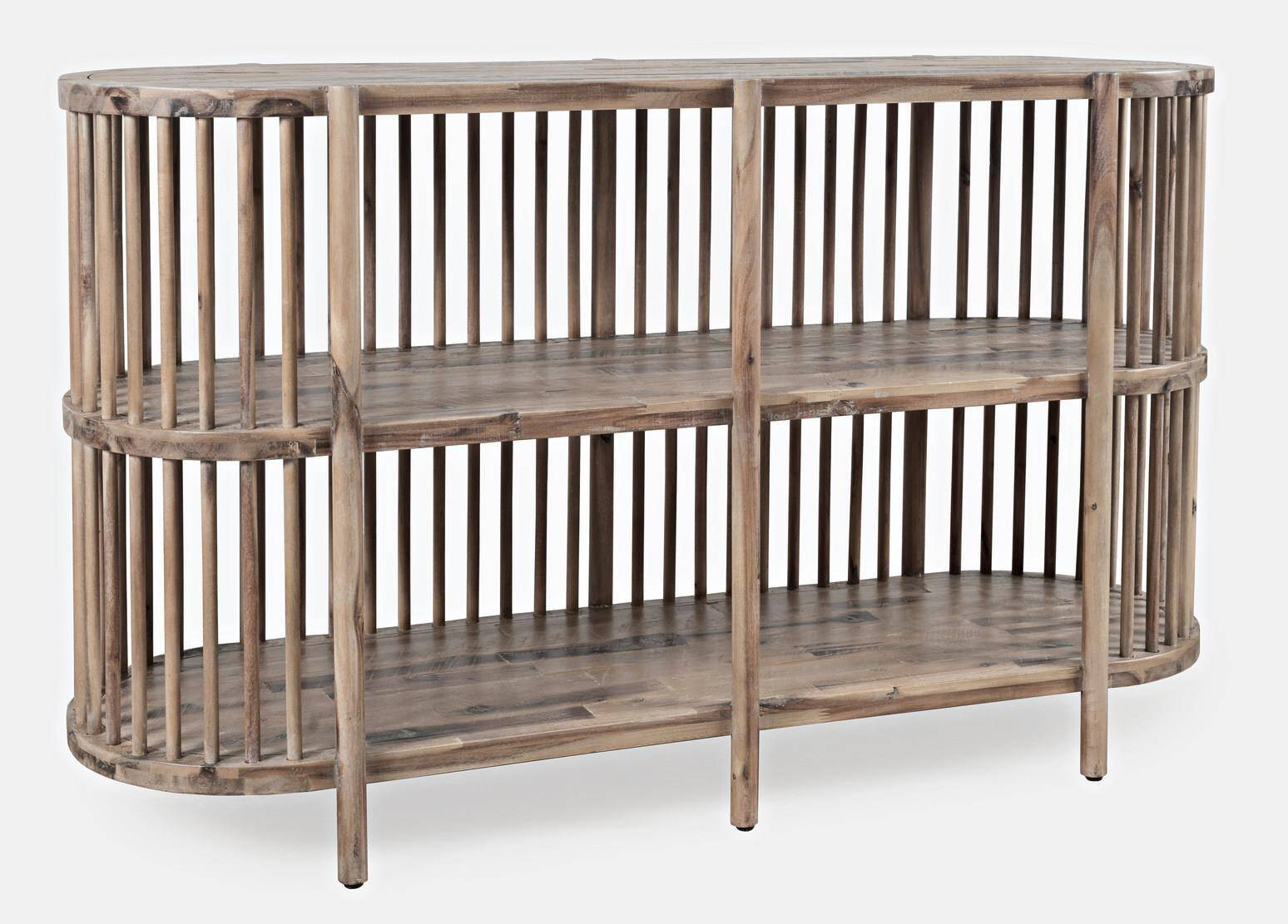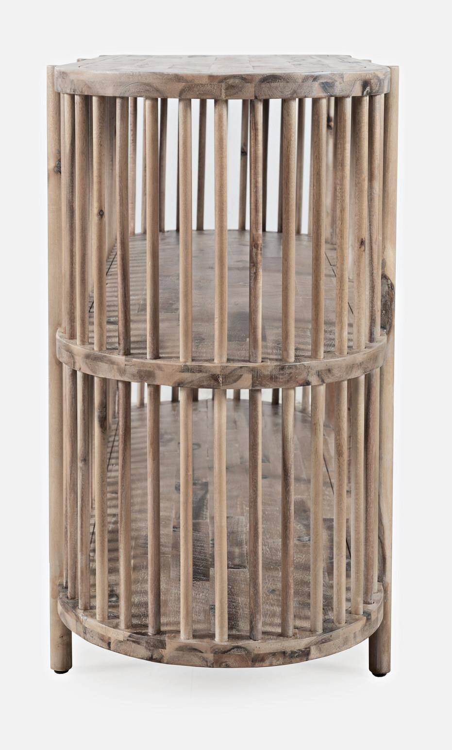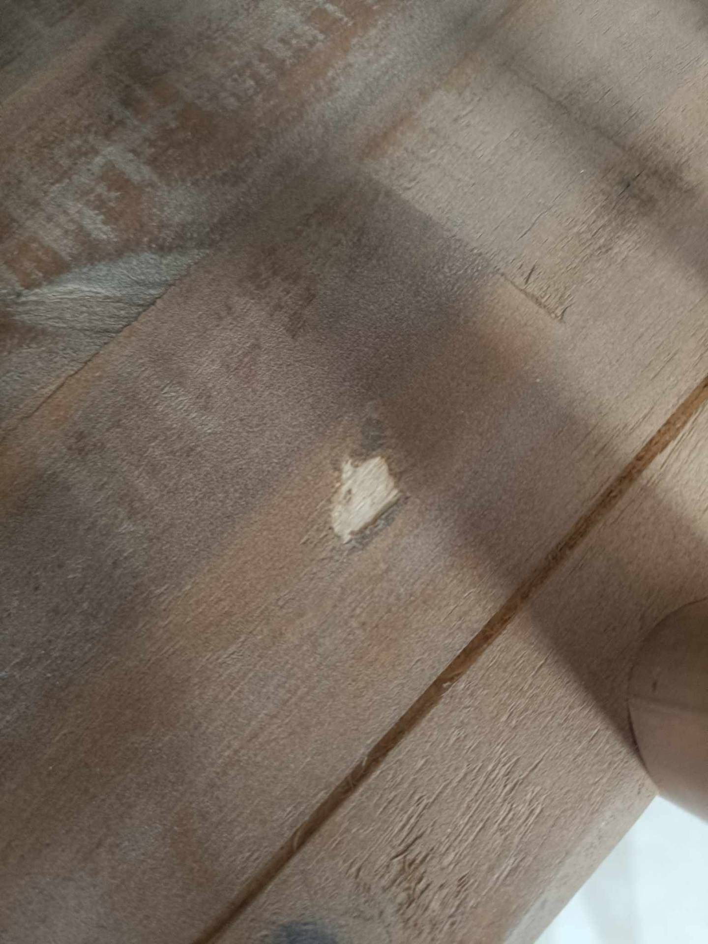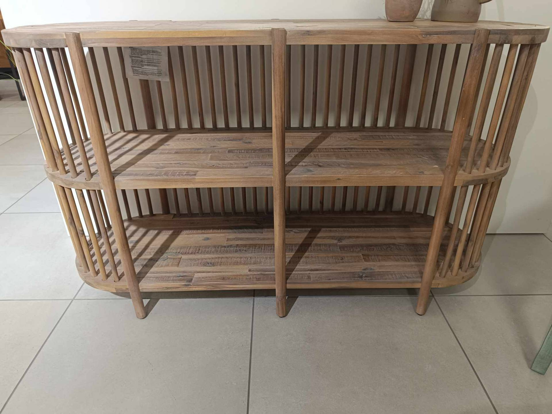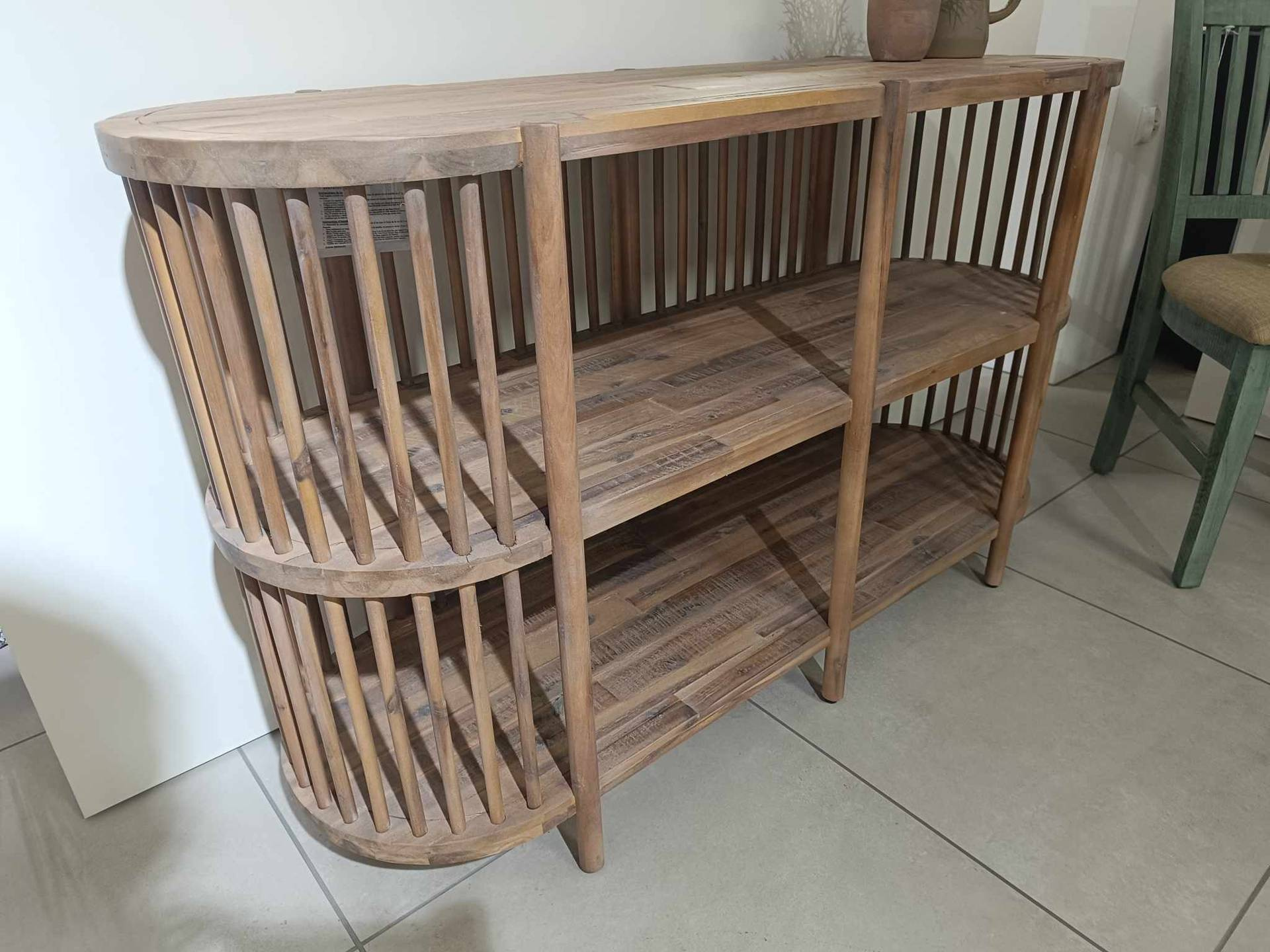 • Komoda o szerokości 137 cm z drewna akacji w kolorze jasnobrązowym z efektownymi pionowymi szczebelkami w stylu industrialnym, vintage, boho. Towar poekspozycyjny, posiada małe uszczerbienie na półce.