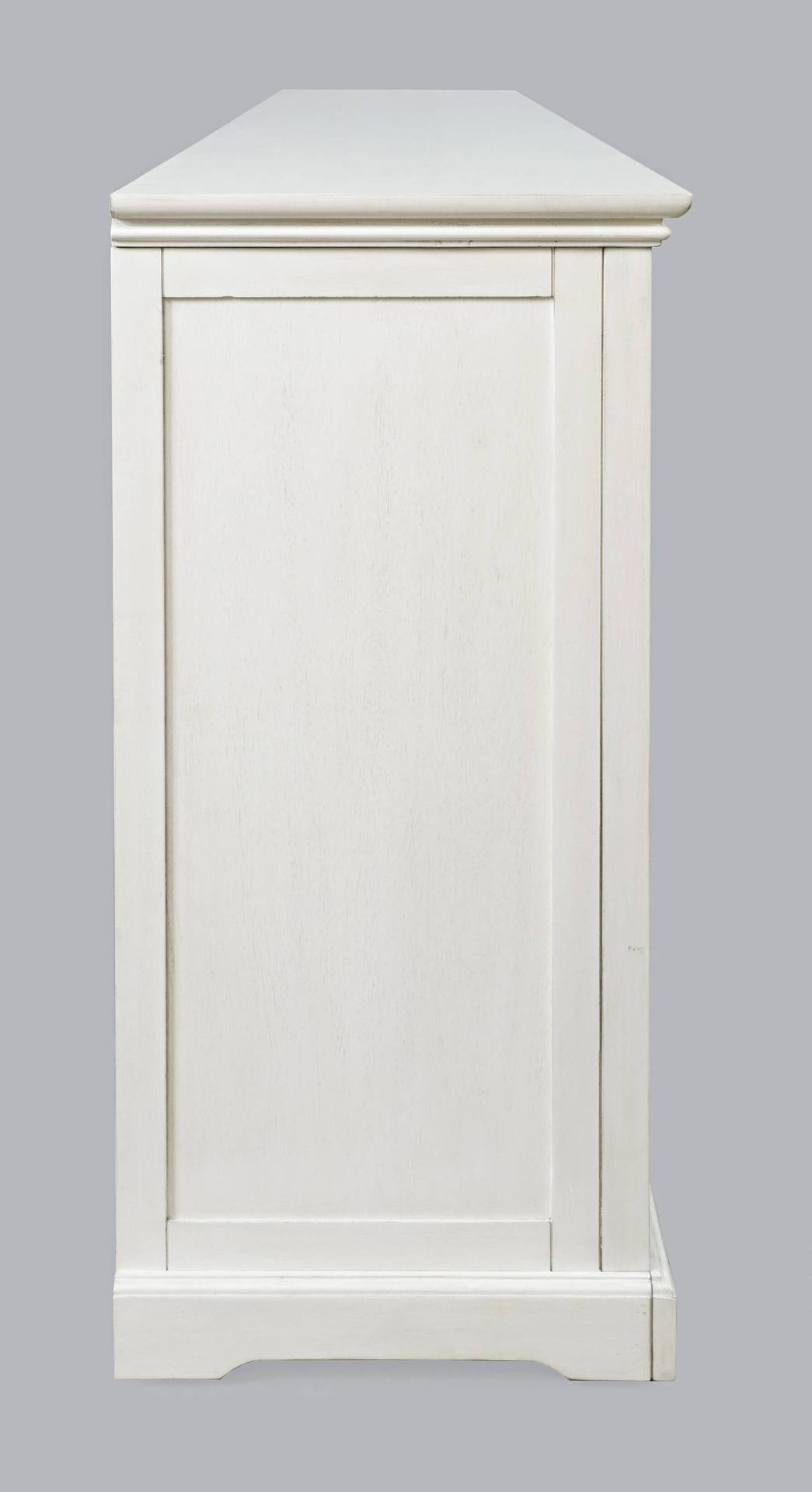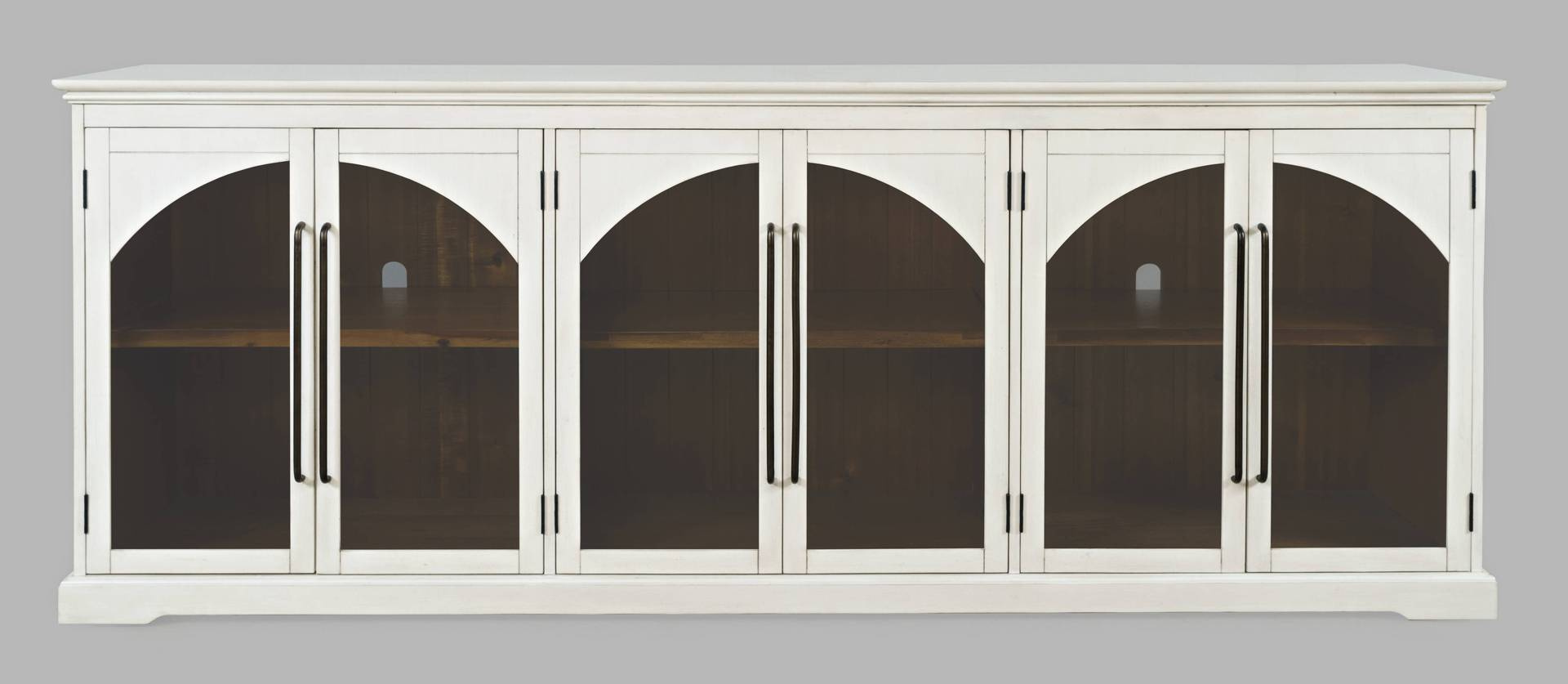 • Komoda o szerokości 244 cm z sześciorgiem przeszklonych drzwi z ozdobnymi łukami oraz solidnymi półkami. Komoda w kolorze białym z eleganckimi podłużnymi uchwytami z metalu. Prosta forma przełamana frezowanymi krawędziami i widoczną strukturą forniru.