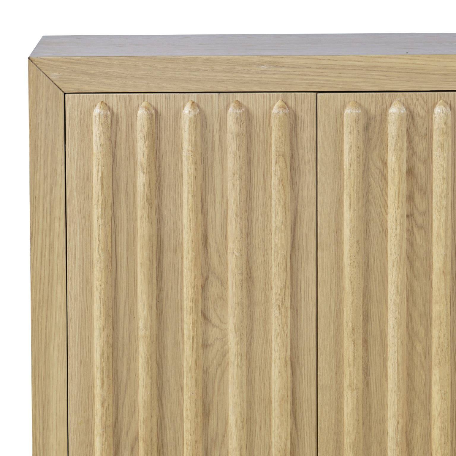 Nowoczesna komoda z drewna dębu amerykańskiego i kauczukowca, z ryflowanym frontem. Posiada 4 drzwi z systemem push to open. Jasny kolor i widoczna struktura drewna dodają elegancji. Idealna do stylowego wnętrza.