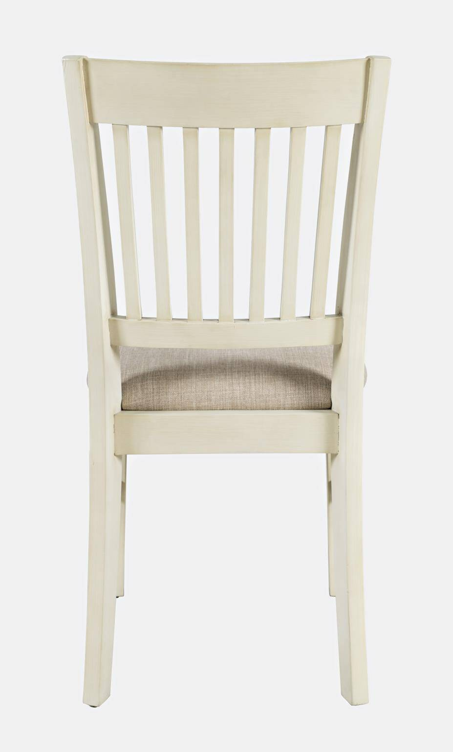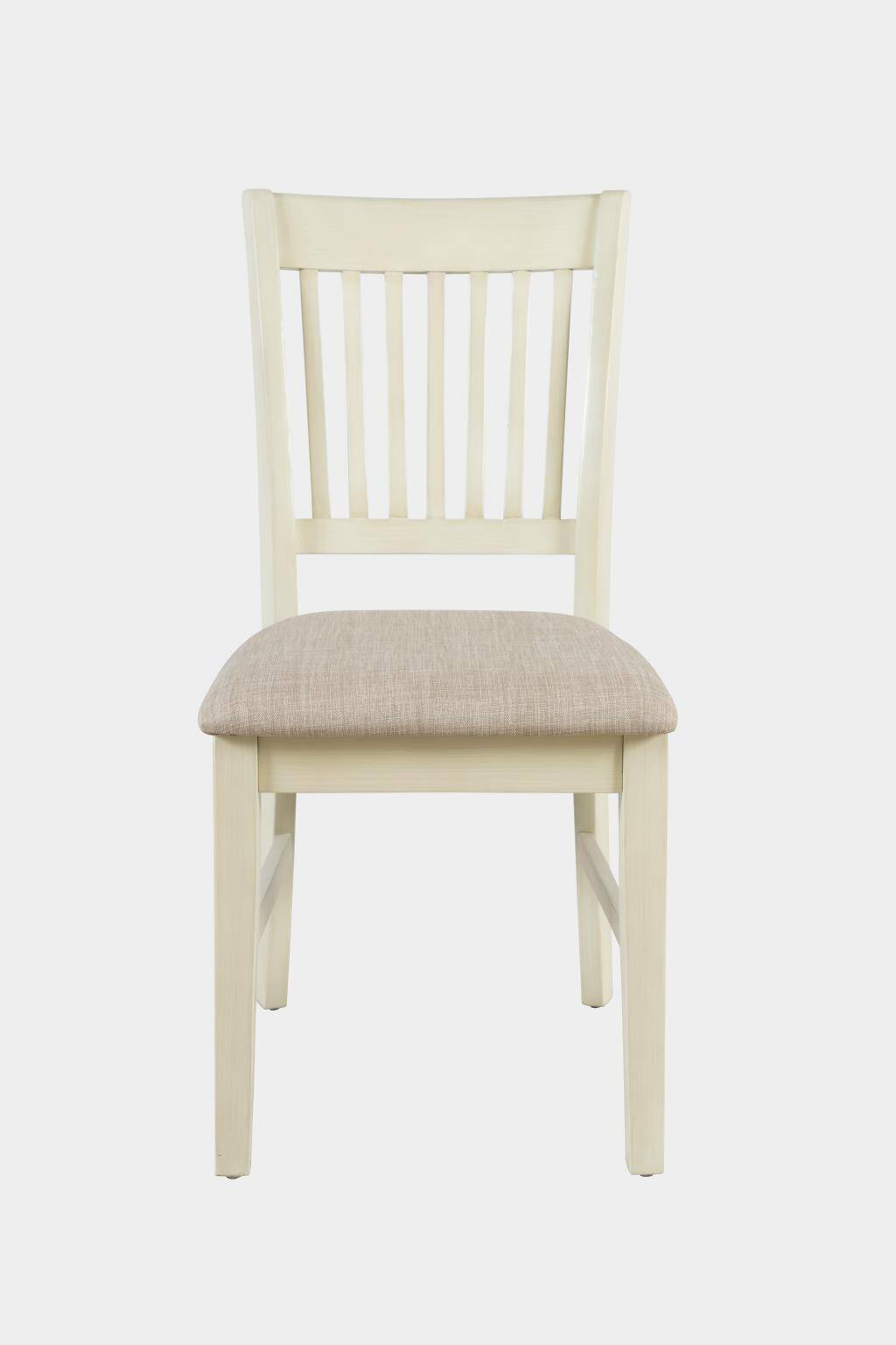 - Krzesło w kolorze kremowym z tapicerowanym siedziskiem w kolorze beżowym. Prostą formę mebla przełamują plecy z pionowymi listewkami.