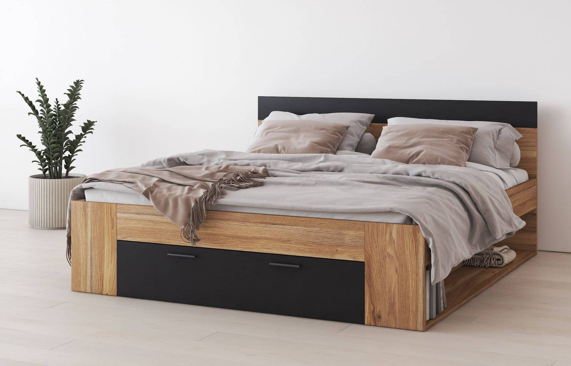 Łóżko Beta łączy nowoczesny design z funkcjonalnością. Wykonane z płyty laminowanej w kolorze czarnym i dąb Mauvella. Posiada praktyczne szuflady na pościel. Idealne do samodzielnego montażu, bez materaca i stelaża. Dodaje elegancji sypialni.