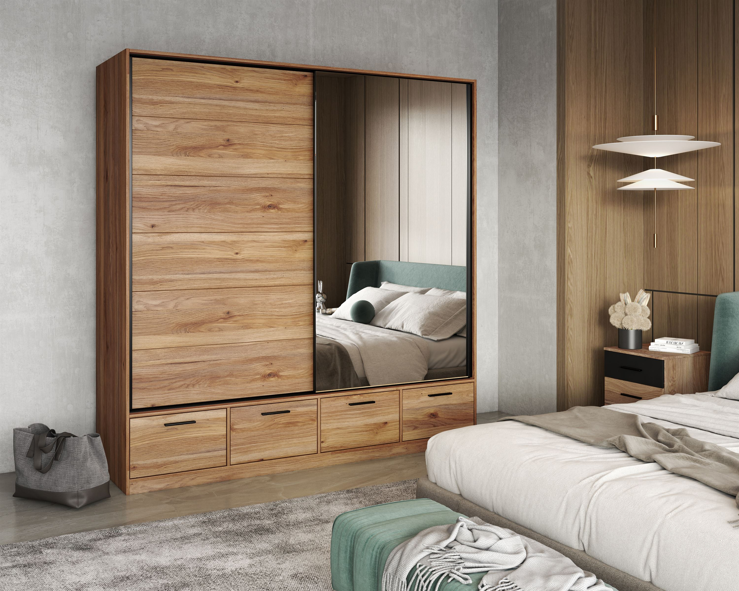 Lustro na froncie szafy to nie tylko element stylistyczny, ale i praktyczny dodatek. Codzienne przygotowania stały się znacznie łatwiejsze, dzięki możliwości spojrzenia w lustro przy wyborze stroju. Dodatkowo, lustro optycznie powiększa pomieszczenie, sprawiając, że sypialnia czy przedpokój wydają się bardziej przestronne i jasne.