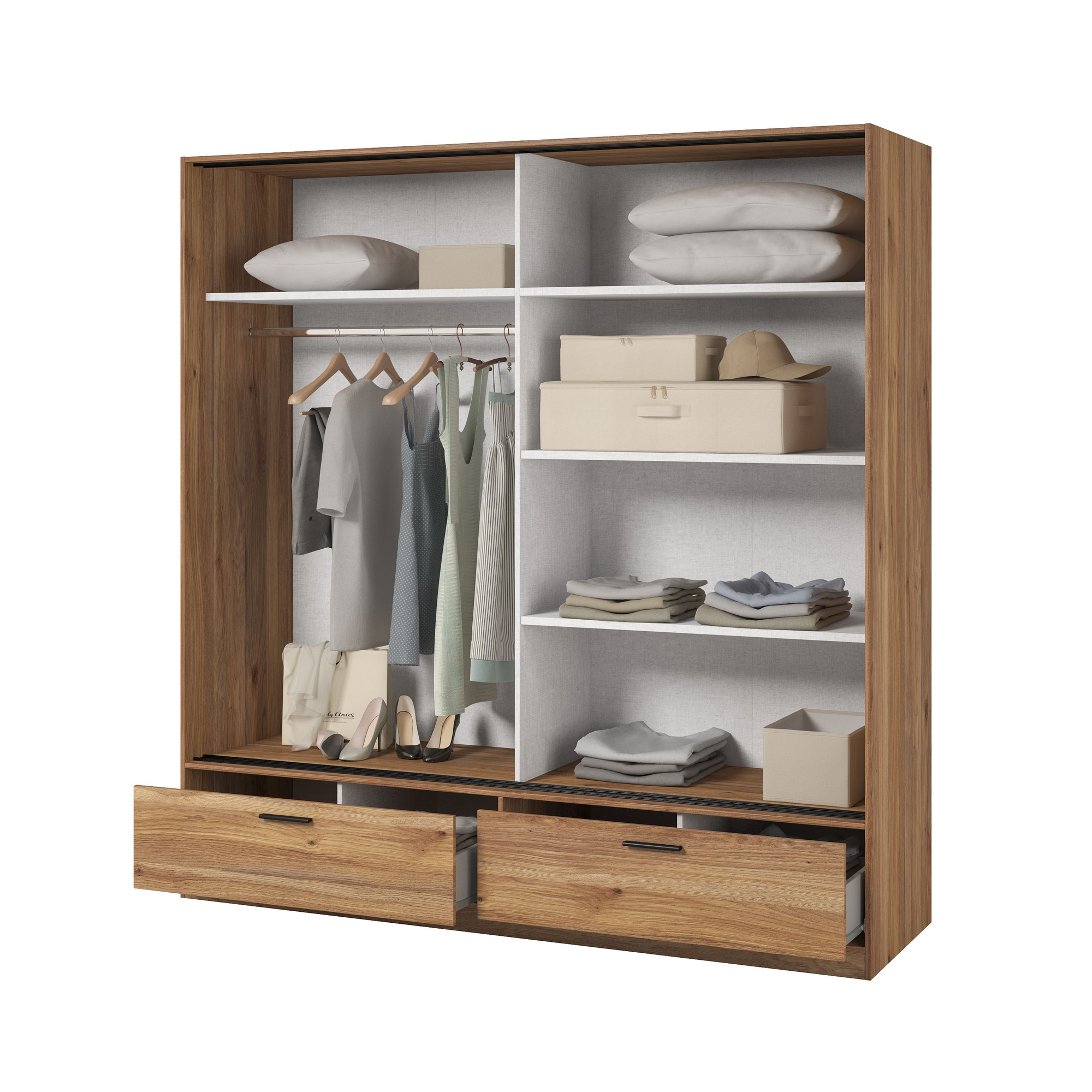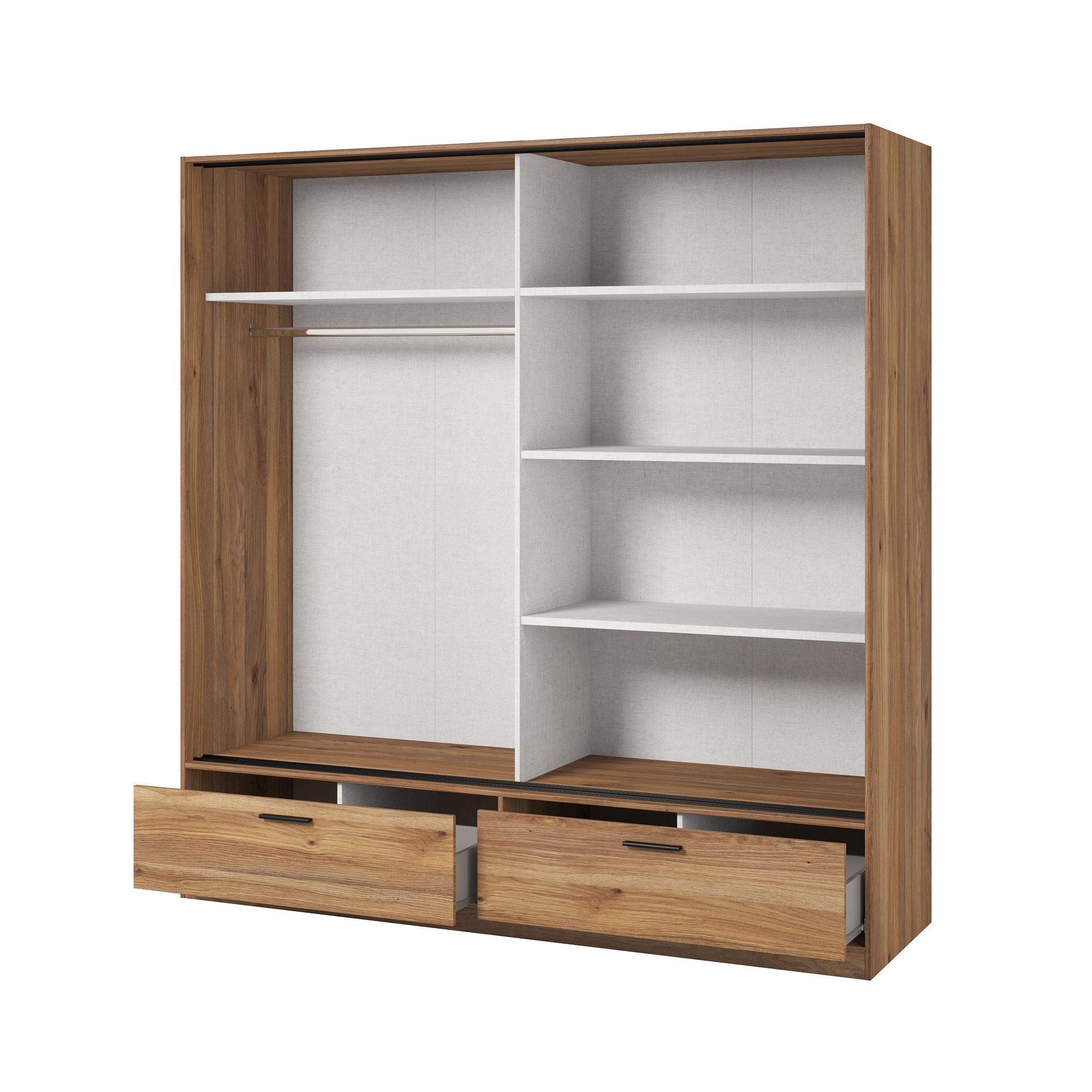 Dzięki drzwiom przesuwnym, szafa Beta oszczędza cenną przestrzeń, co jest niezwykle ważne w mniejszych pomieszczeniach. Możesz cieszyć się jej funkcjonalnością nawet w wąskich korytarzach czy sypialniach. Montaż szafy jest prosty i intuicyjny, co pozwala szybko wkomponować ją w Twoje wnętrze, dodając przy tym odrobinę nowoczesnego charakteru.