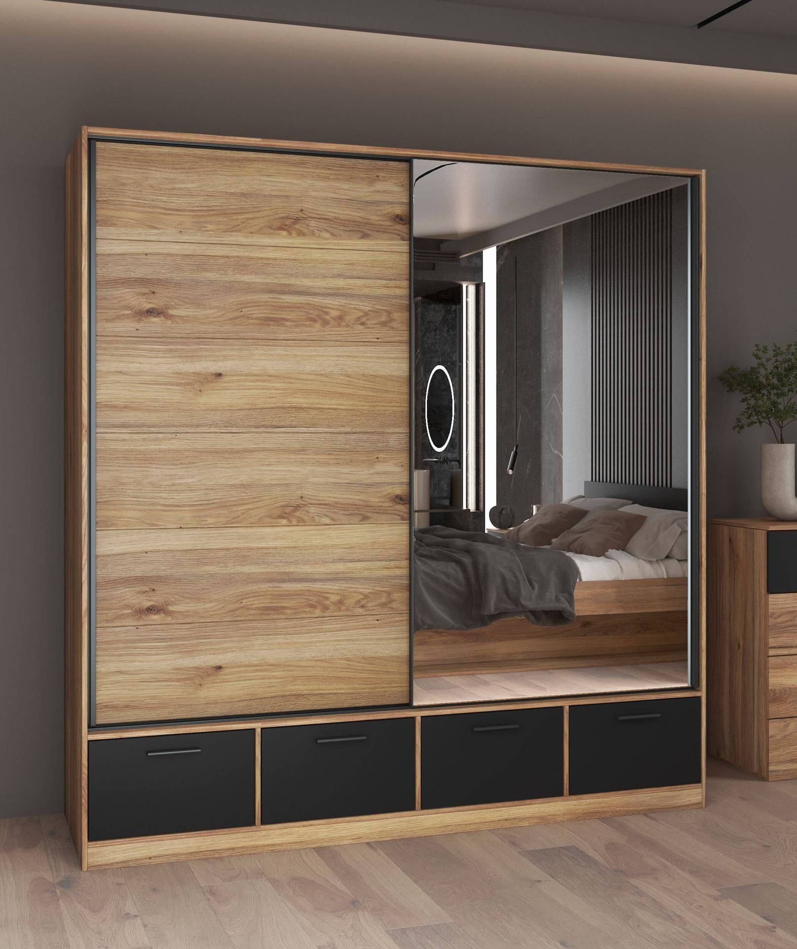 Odkryj elegancki świat nowoczesnego designu dzięki szafie Beta 2D4S z lustrem, która perfekcyjnie łączy piękno i funkcjonalność. Korpus wykonany z wyrazistego Dębu Mauvella harmonijnie współgra z matowymi, czarnymi frontami, tworząc nieszablonową i jednocześnie przytulną przestrzeń w każdym wnętrzu. To połączenie kolorów jest prawdziwym odzwierciedleniem współczesnych trendów i doda Twojemu domowi nuty luksusu.